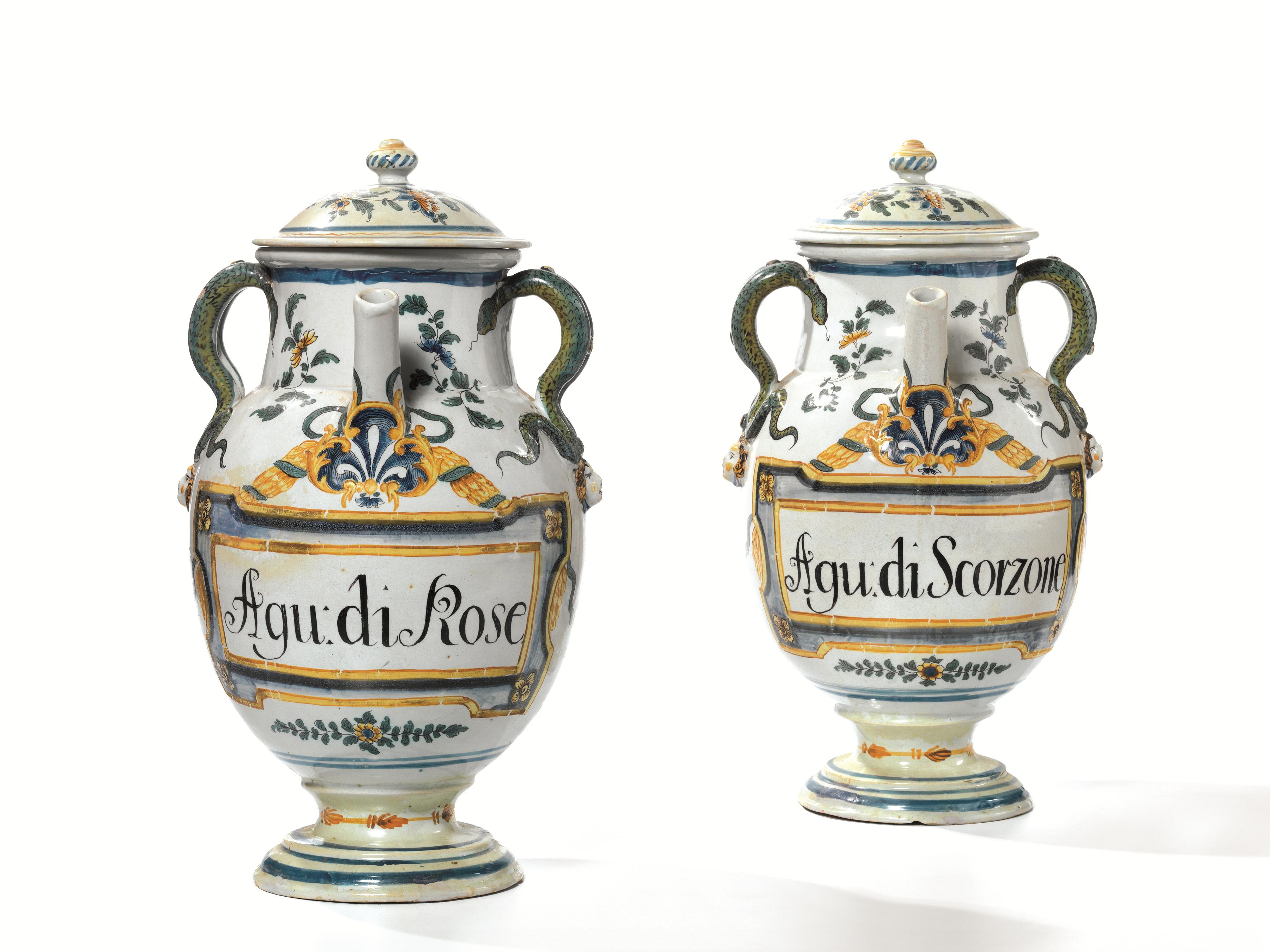 Coppia di versatoi con coperchio, Pesaro, 1787, in maiolica decorata con ramoscelli di fiori con cartigli iscritti Agu di Sorzone e Agu di Rose, manici modellati a serpente,