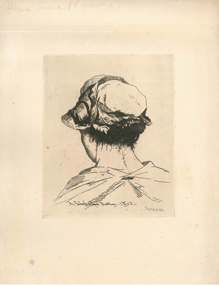 Henri Charles Guérard (Parigi, 1846-1897) fu un artista, incisore e litografo francese. Iniziò a incidere nel 1870, sotto la protezione di Nicolas Berthon. Amico di Manet, frequentò il salone di Nina de Villard. Insieme all'attrice Ellen Andrée posò per Manet per il dipinto intitolato "Au Café". Manet apprezzò molto il lavoro di Guérard, considerandolo l'unico incisore di alta qualità. Nel 1879 sposò Eva Gonzales, pittrice, allieva, modella e amica di Manet. Nel 1881 incise l'opera dal suo suocero Emmanuel Gonzales "Le carovane di Scaramouche". Nel 1883, Guérard contribuì al "Art Japon" di Louis Gonse, pubblicata da Albert Quantin. Ad aprile dello stesso anno pubblicò "Japonisme", un album di dieci acqueforti di Edmond Sagot. Nel 1889, con il suo amico Félix Bracquemond, creò la SSocietà di pittori-incisori francesi che espose alla Galerie Durand-Ruel.