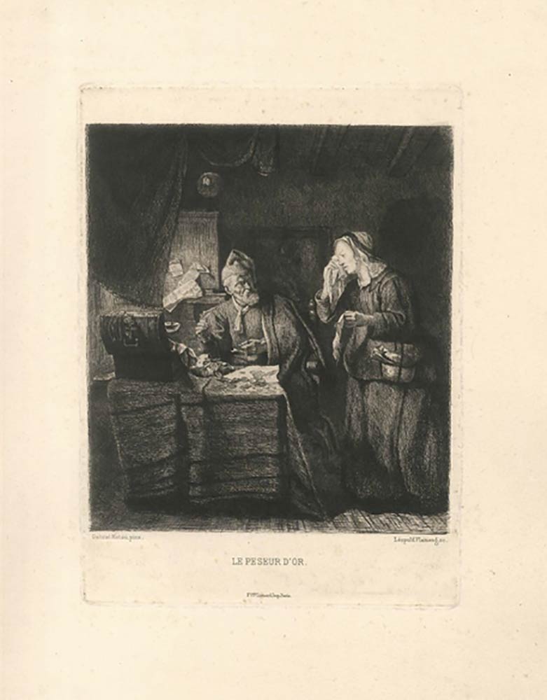 Le Peseur d'Or (The Money Exchanger) è una meravigliosa acquaforte in bianco e nero su carta vergellata color crema, realizzata da Léopold Flameng dall'artista fiammingo Gabriel Metsu (Leida, 1629 - Amsterdam, 1667).
