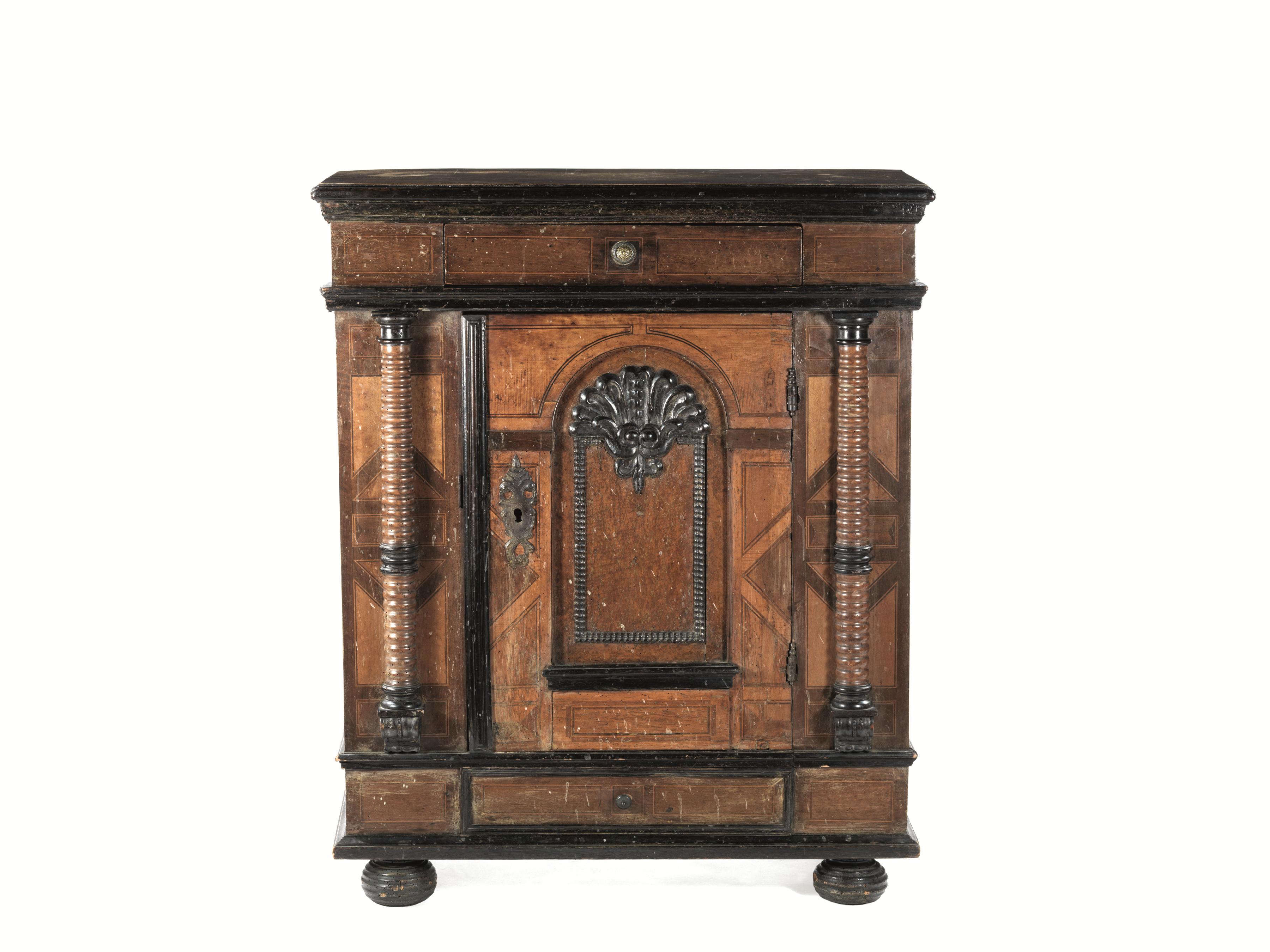 Credenzino, Alto Veneto, prima metà sec. XVIII, in legno dolce dipinto a finto noce intarsiato con profili ebanizzati, piano rettangolare con becco di civetta, un cassetto nella fascia, sportello con formella centinata inquadrata da colonne a tortiglione, un cassetto nel basamento, base modanata piedi a cipolla, cm 101x49x122, lievi danni