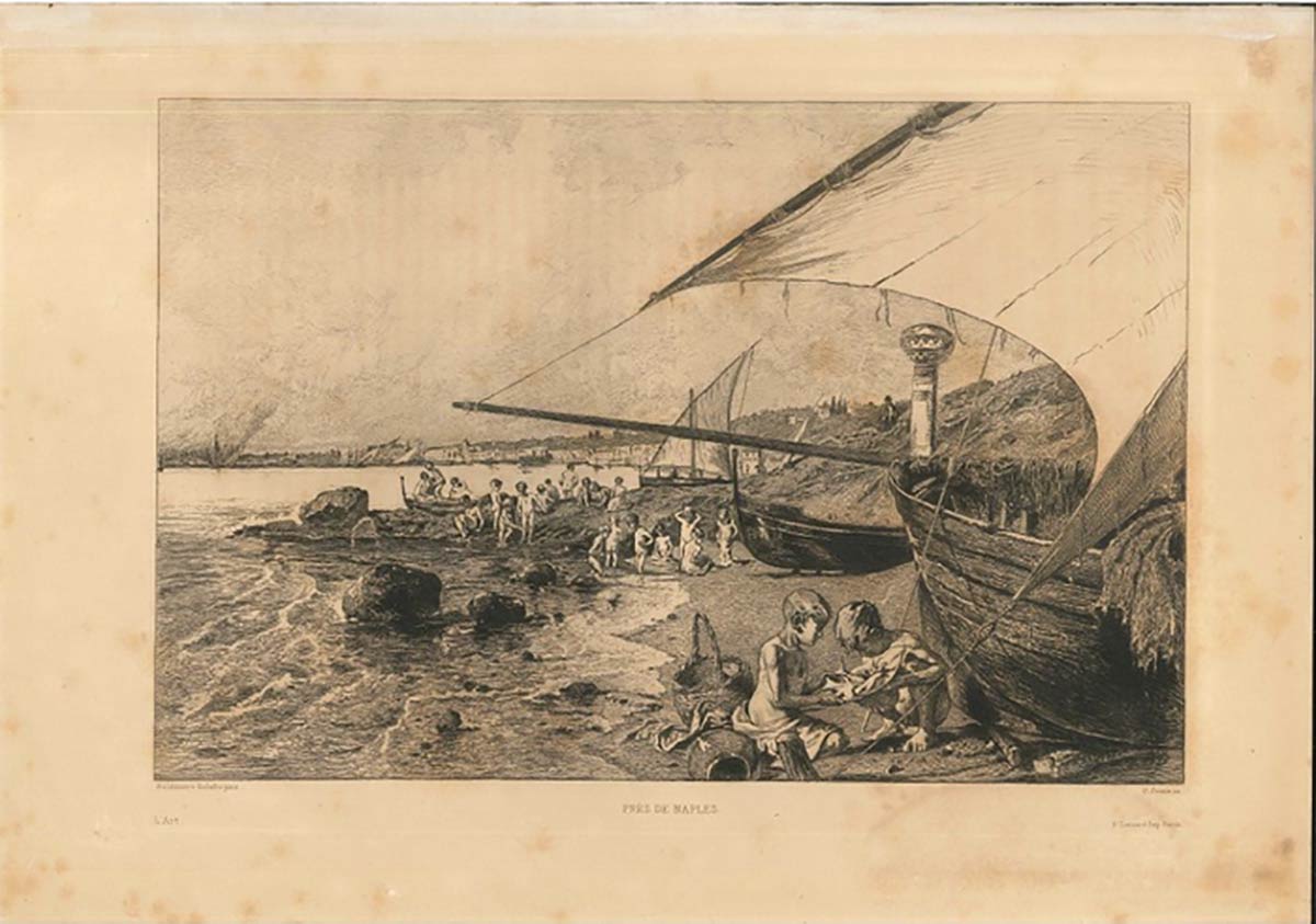Bella e luminosa composizione, veduta di un porto in Italia, vicino a Napoli. La presenza di diversi bambini nudi che giocano con le conchiglie rende composizione molto folcloristica.