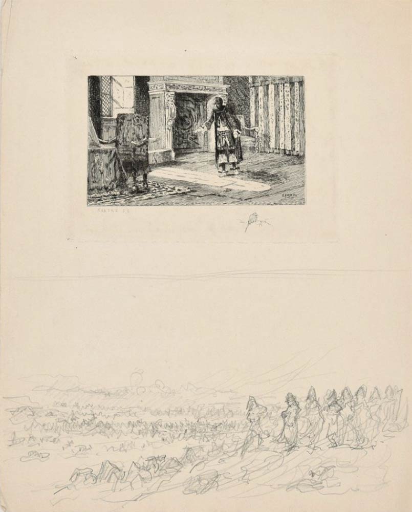 Bellissima opera d'arte che rappresenta una scena di interno con una figura maschile al centro della stanza. La stanza è arredata con un grande camino antico e con mobili molto eleganti. Nella parte inferiore del foglio c'è uno schizzo di una battaglia con diverse figure disegnate a matita.