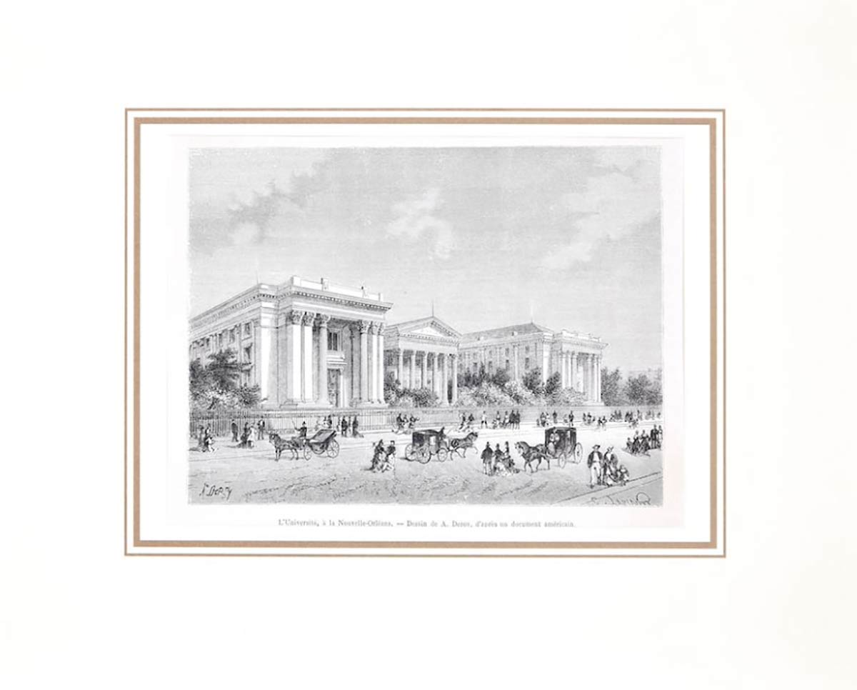 Meravigliosa xilografia in bianco e nero su carta, realizzata nel 1880 dall'artista francese Charles Laplante (Sévres 1837 - Parigi, 1903) dal disegno di A. Deroy. Titolo originale: L'Université, à la Nouvella-Orléans Firmato su lastra sui lati. Titolata su lastra al centro del margine inferiore. Incluso un passepartout di cartone bianco. In ottime condizioni. Questa bellissima stampa fu un'illustrazione per il quotidiano "Le Tour du Monde". Sotto l'immagine e sul retro una parte di un articolo di questo giornale. Con un'incredibile freschezza delle linee, l'equilibrio di luci e ombre e la meticolosità del tratto, questa stampa rappresenta il magnifico edificio dell'università di New Orleans.