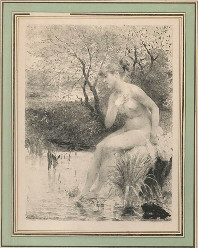 Opera d'arte molto fresca e delicata rappresentante una corpulente donna nuda vicino ad un laghetto. Lo sfondo presenta dei alberi e una vegetazione densa. La composizione e la eleganza e delicatezza della figura femminile rende questa opera molto interessante.