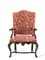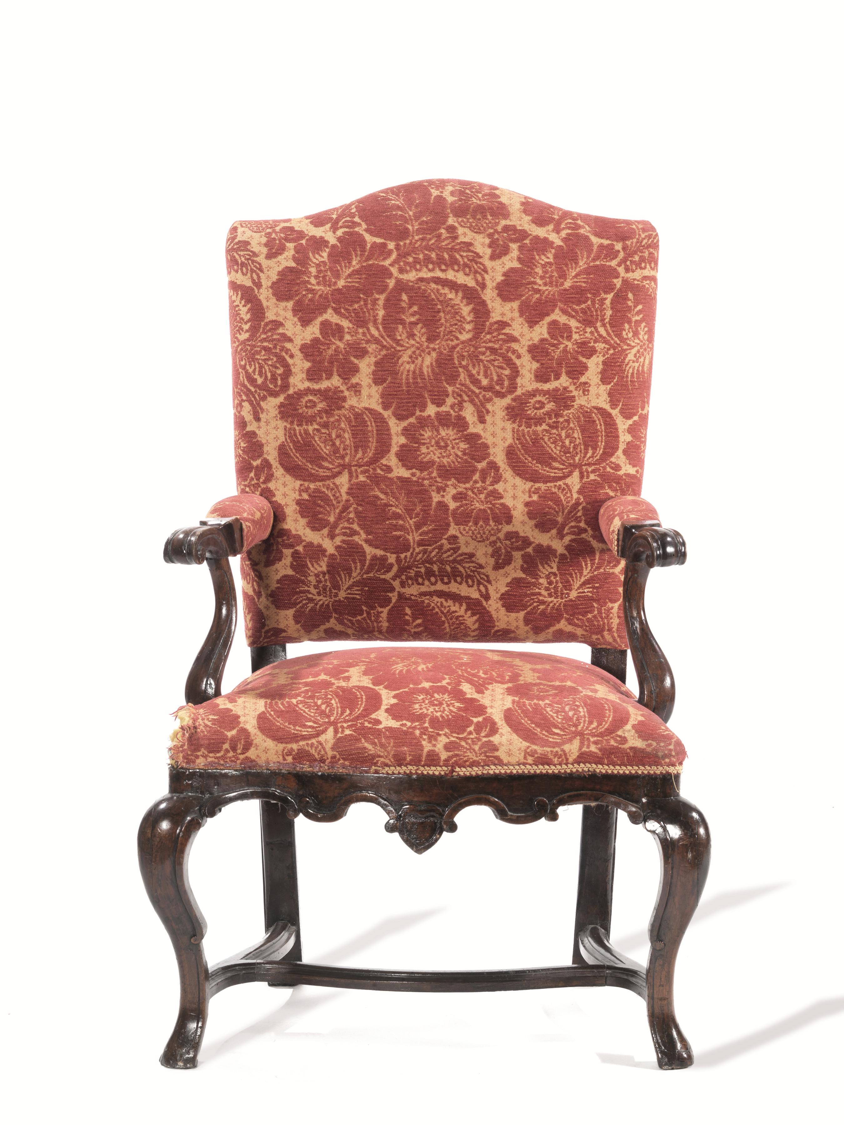Seggiolone, Italia settentrionale, prima metà sec. XVIII, in noce a patina scura, spalliera sagomata, braccioli a giorno su sostegni mossi, gambe sinuose su piedi a zoccolo stilizzato riunite da traversa ad H, ricoperta in cotone operato rosso, traversa di restauro