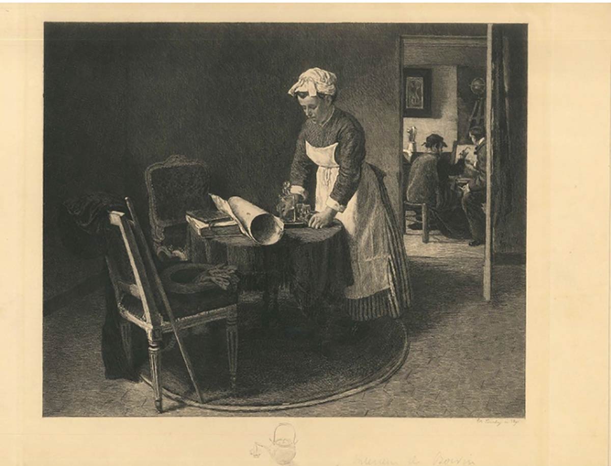 Meravigliosa acquaforte realizzata nel 1891 da Charles Courtry da François Bouvin. Prova d'autore, avant la lettre, con un timbro a secco "AL Bristol" nell'angolo superiore sinistro e prima dell'edizione pubblicata su "Art". Primo stato su tre. Firmata e datata su lastra in basso a destra, sotto l'immagine. Ottime condizioni. Questa opera d'arte moderna rappresenta una scena di vita ordinaria.