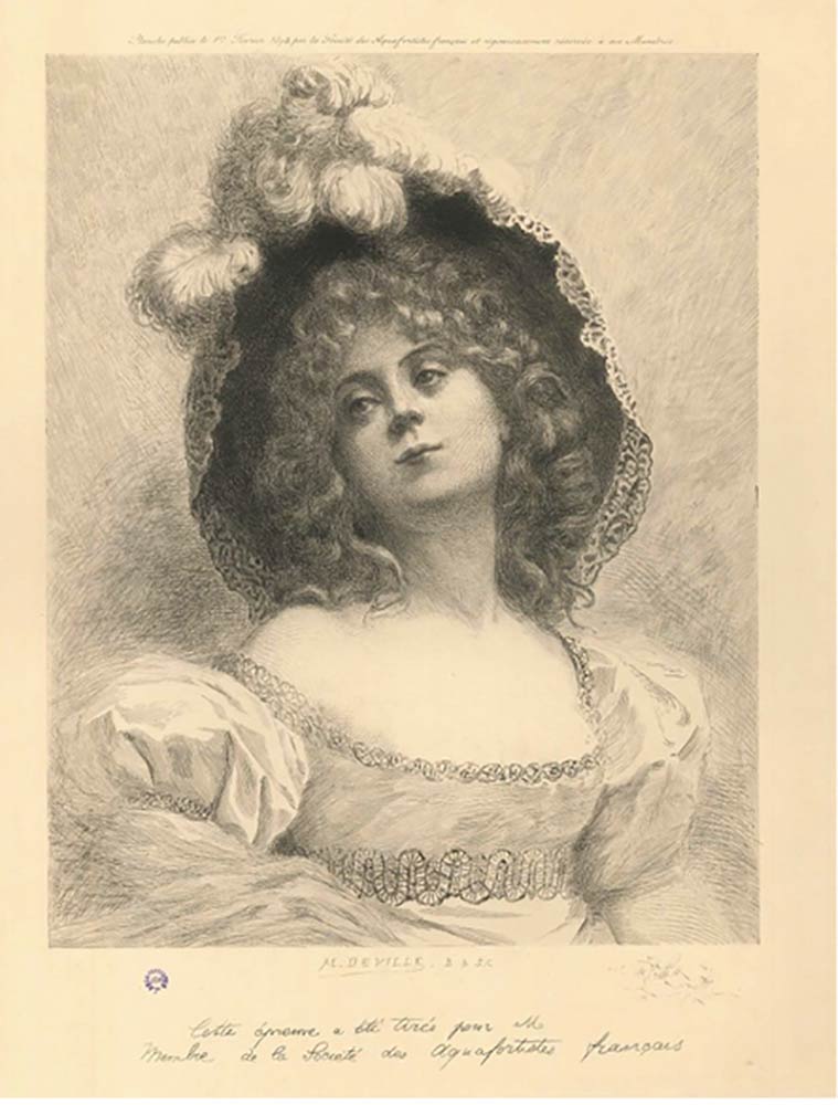Questa stampa originale rappresentante un superbo ritratto femminile con un tocco molto sicuro, è una bella prova d'artista, avant la lettre, con una dedica autografa e un timbro a inchiostro blu sul margine inferiore "Société des Aquafortistes Français".