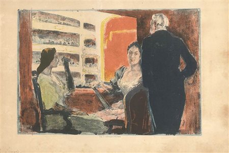 "Pendente l'entracte" è una bella litografia colorata su carta, firmata a matita in basso a sinistra da Alexandre Lunois (1863-1916). Questa litografia è stata stampata da A. Lafontaine e Fils (Parigi) (come riporta la nota sul margine inferiore al centro) ed è stata pubblicata dal quotidiano francese "L'Artiste" n. 12 nel 1894. Prova d'artista, avant la lettre, primo stato su due, prima della pubblicazione sul quotidiano "L'Artiste".