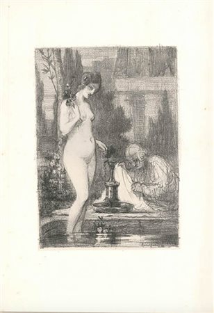 Opera realizzata da Charles Guerin nel 1895. Litografia originale su carta. Firmata e datata su lastra in basso a destra. Prova d'autore. Il foglio è incollato su cartoncino. Ottime condizioni.Interessante composizione raffigurante un affascinante nudo femminile alla fontana. La figura è caratterizzata da una grande eleganza.