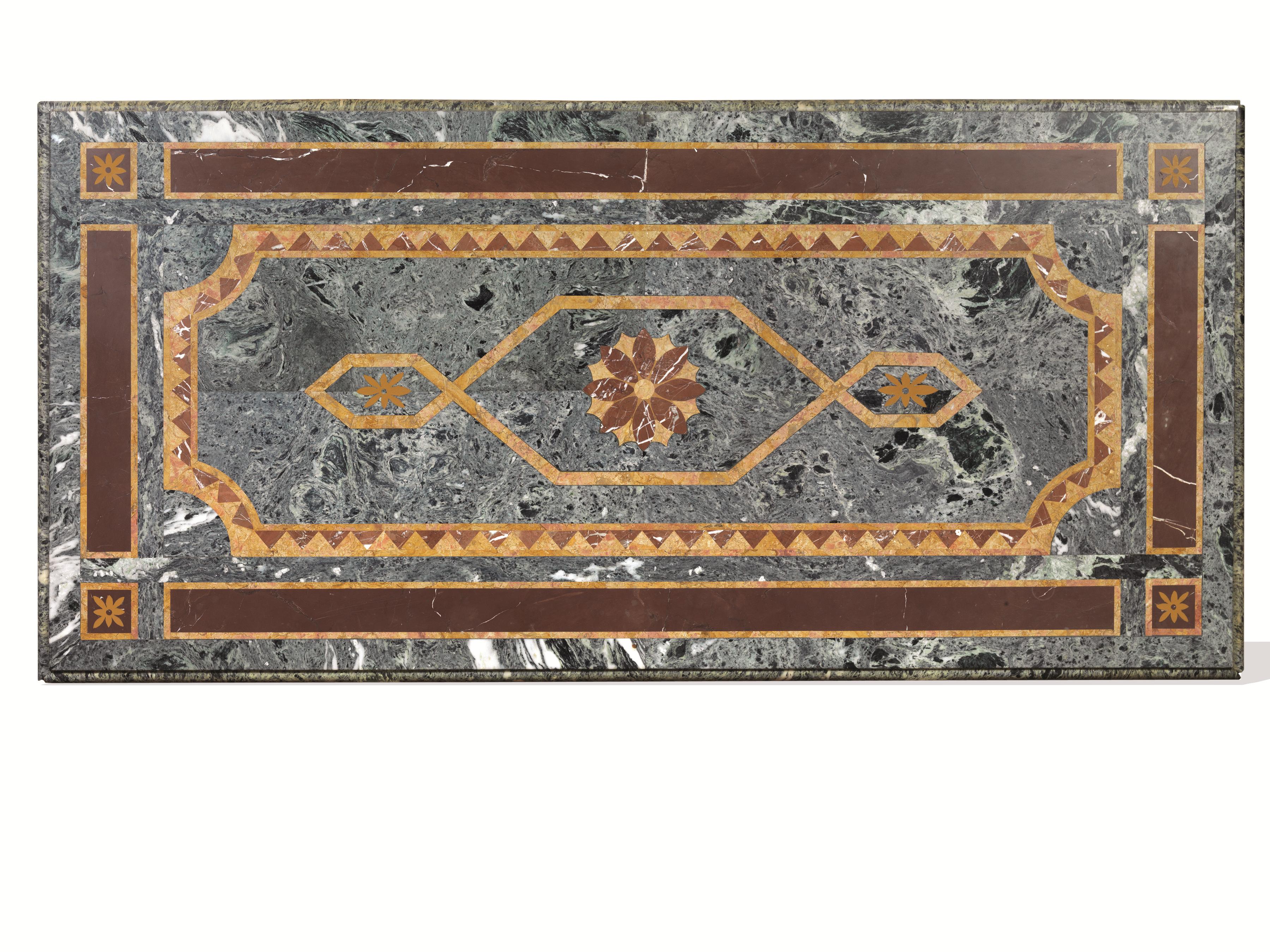 Piano in commesso di marmi policromi, su base in breccia di marmo verde con intarsi in diaspro e marmo giallo a motivi geometrici, cm 191x95