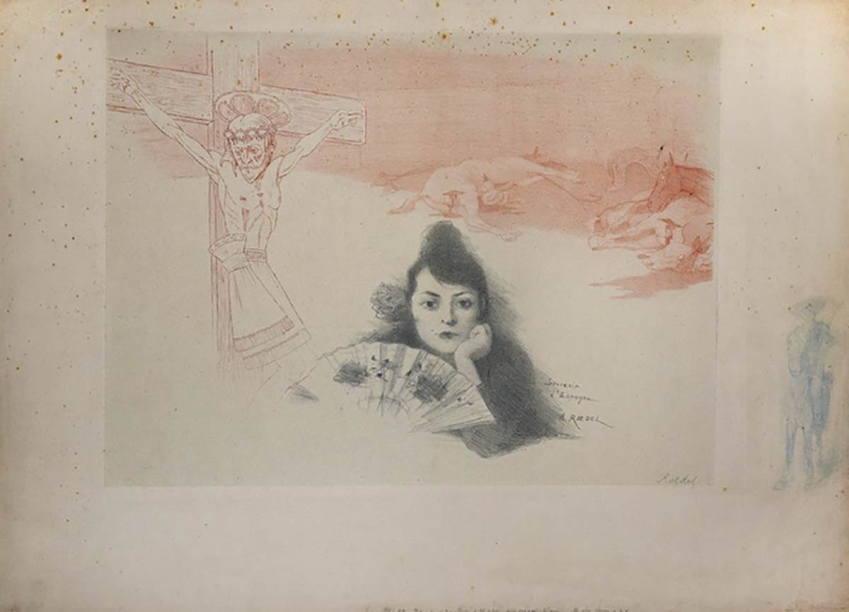 "Souvenir d'Espagne" è un'opera d'arte originale realizzata da Auguste Roedel nel 1903. Litografia con disegno a matita sul margine centrale inferiore. Firmata a matita dall'artista in basso a destra. Passepartout incluso. Discrete condizioni salvo qualche fioritura al margine superiore. Opera molto interessante che rappresenta una figura femminile con Cristo a sinistra e alcuni animali a destra. L'artista incluse nell'immagine alcuni ricordi spagnoli. L'opera è stata realizzata dall'artista francese Auguste Roedel (nato nel 1859).