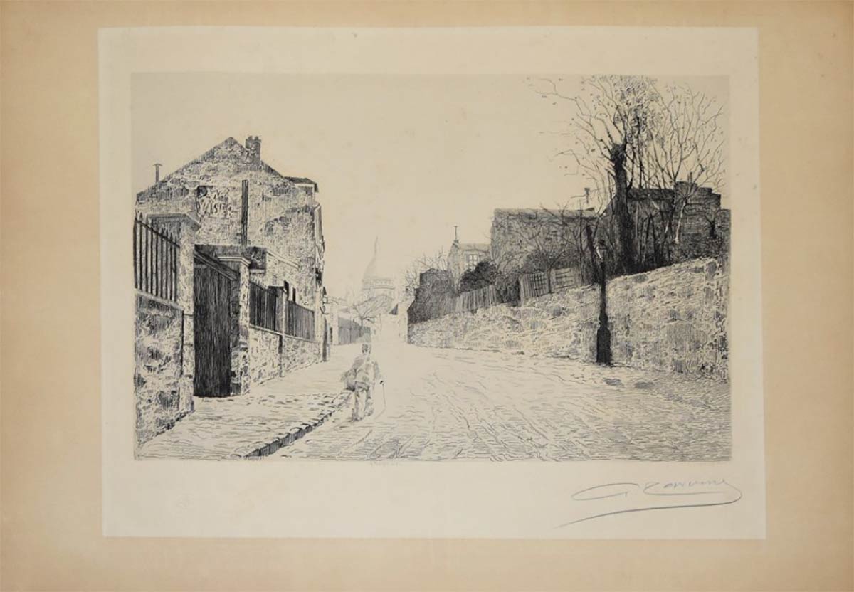 "La Rue de l'Aubreuvoir à Montmarte" è un'opera d'arte originale realizzata da Gustave Taverne nel 1904. Acquaforte su carta vergata. Firmata dall'artista con matita in basso a destra. Firmata su lastra al margine centrale inferiore. Buone condizioni tranne qualche lieve fioritura ai margini. L'opera fa parte del cachet de la "Société des Amis de l'Eau Forte". Bellissima acquaforte raffigurante una strada e alcuni edifici con una figura umana al centro della composizione. Le linee sono caratterizzate da una intensa freschezza.