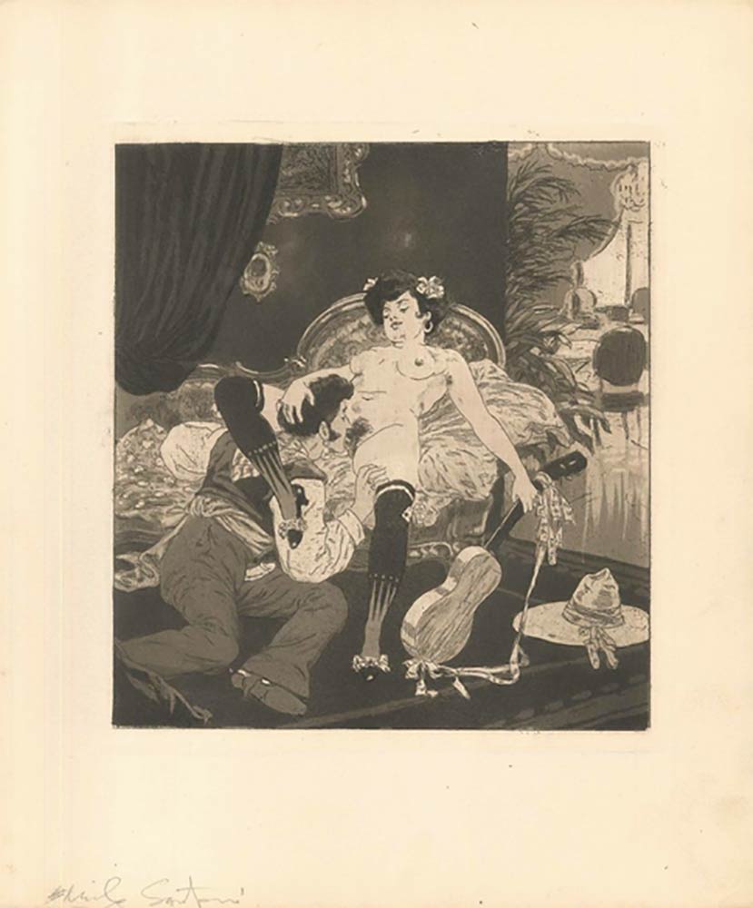 Acquaforte e acquatinta su carta color avorio, firmata a matita in basso a sinistra. Edizione di 530 esemplari. Compresa una poesia di Amadée de la Houlette. Rappresenta una scena erotica vintage.