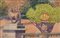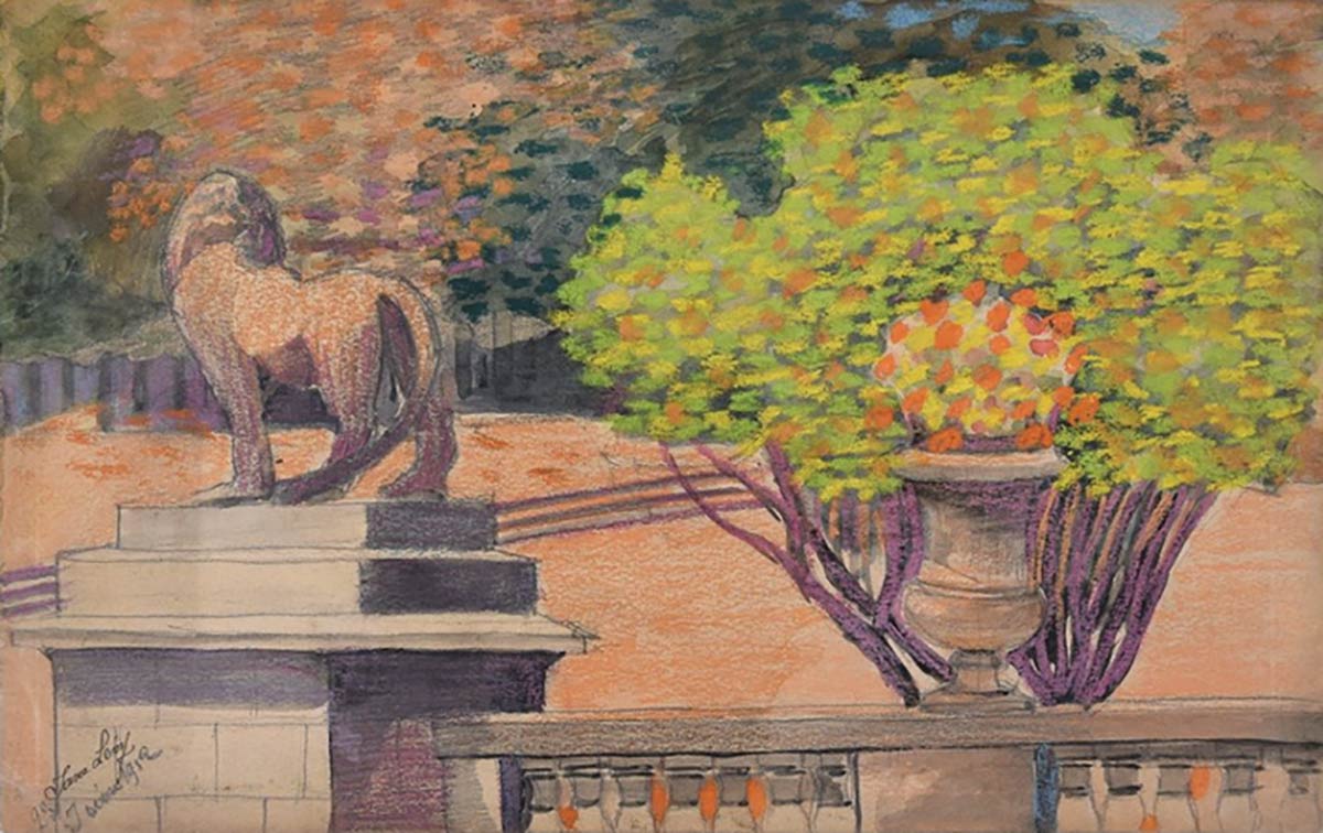 Bella composizione raffigurante un giardino con la balaustra decorata con una scultura di un leone e un vaso di fiori. Jane Levy (Parigi, 1894) fu un'artista francese e una 'pastelliste', una degli alunni di Sabatté e Hannaux. Espose al Salon des Indépendants e al Salon des Artistes Françaises.