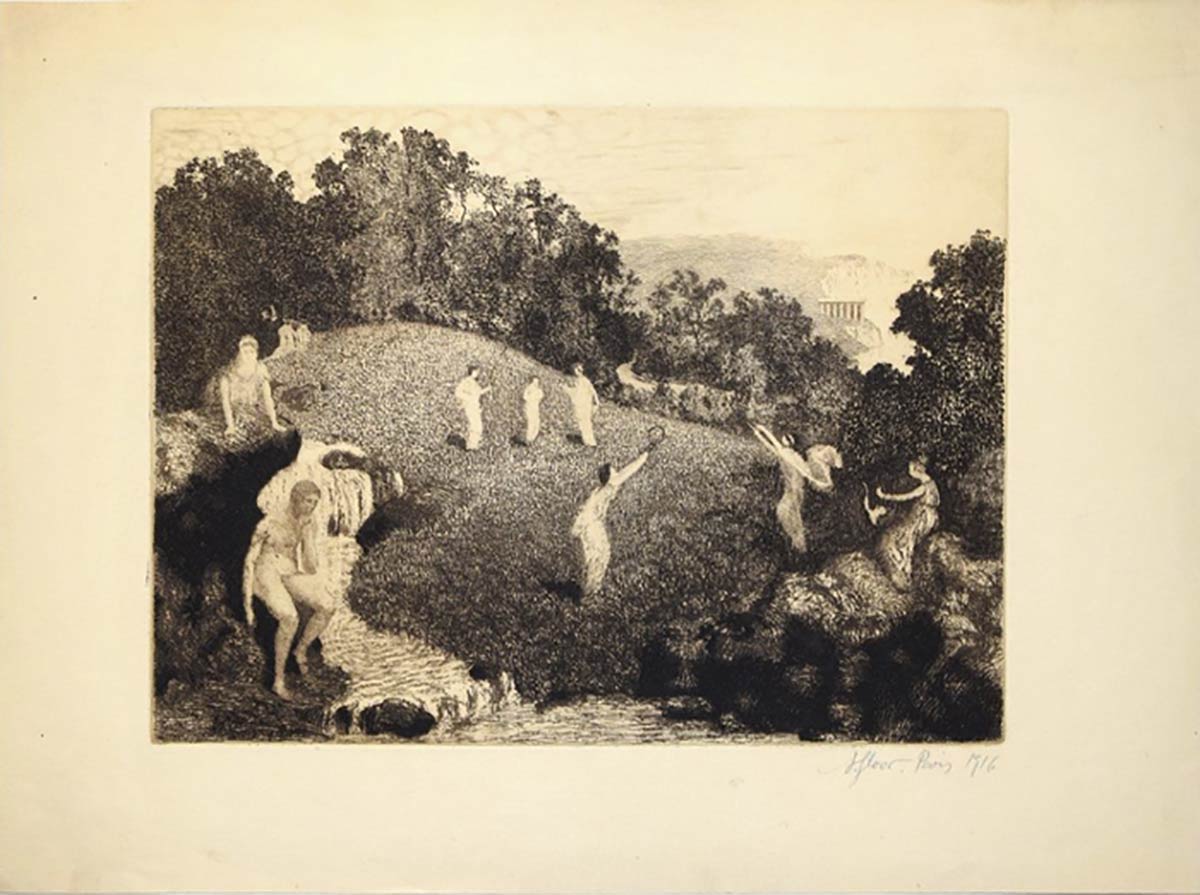 Un'opera realizzata da Jules Adrian Flour nel 1916. Acquaforte su carta incollata su cartoncino. Firmata dall'artista a matita e numerata in basso a destra. Ottime condizioni.