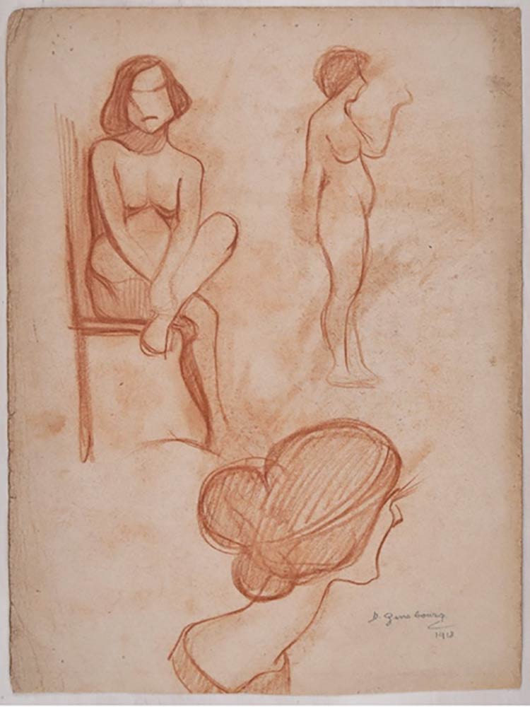 Opera realizzata dall'artista francese Ginsbourg nel 1918. Matita e matita rossa su carta. Firmata e datata a matita in basso a sinistra "Ginsbourg 1918". Disegni presenti anche sul retro del foglio. Buone condizioni.