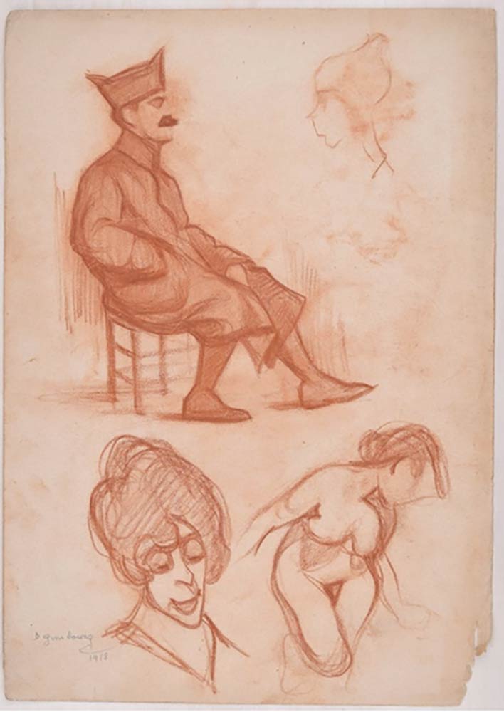 Opera realizzata dall'artista francese Ginsbourg nel 1918. Matita e matita rossa su carta. Firmata e datata a matita in basso a sinistra "Ginsbourg 1918". Disegni presenti anche sul retro del foglio. Buone condizioni.