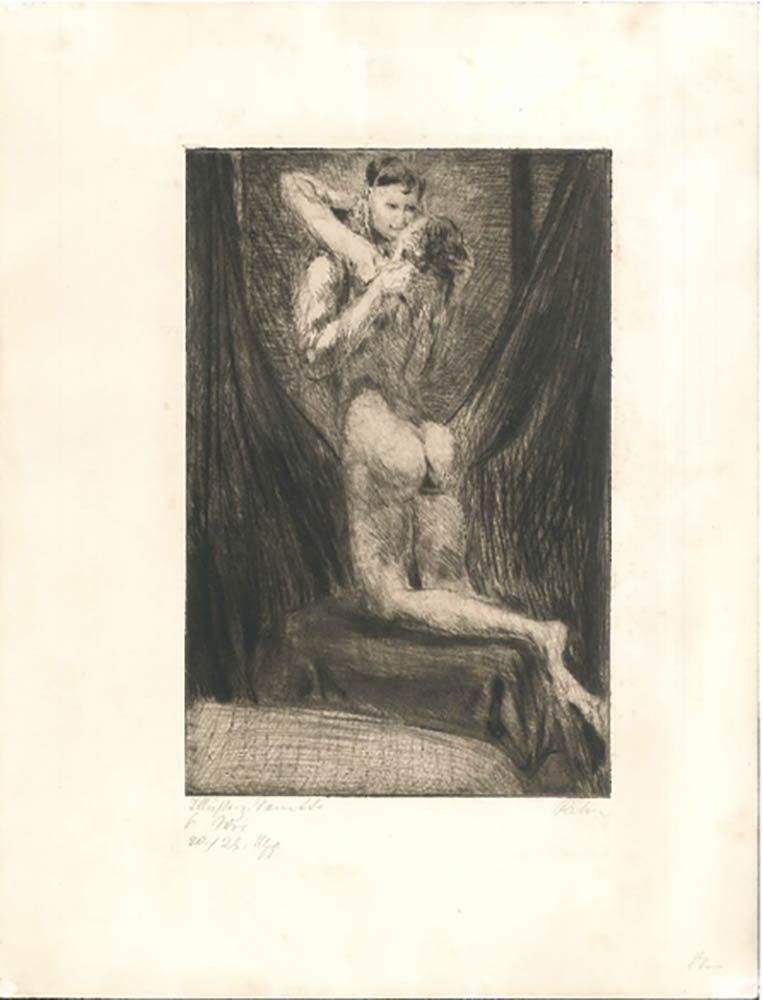 Firmata "Rehn" a matita in basso a destra. Intitolata e numerata a matita sul margine inferiore sinistro. Edizione di 25 esemplari. Dalla serie di 18 acqueforti "Mein Weg mit dem Weib", pubblicata a Dresda nel 1919.