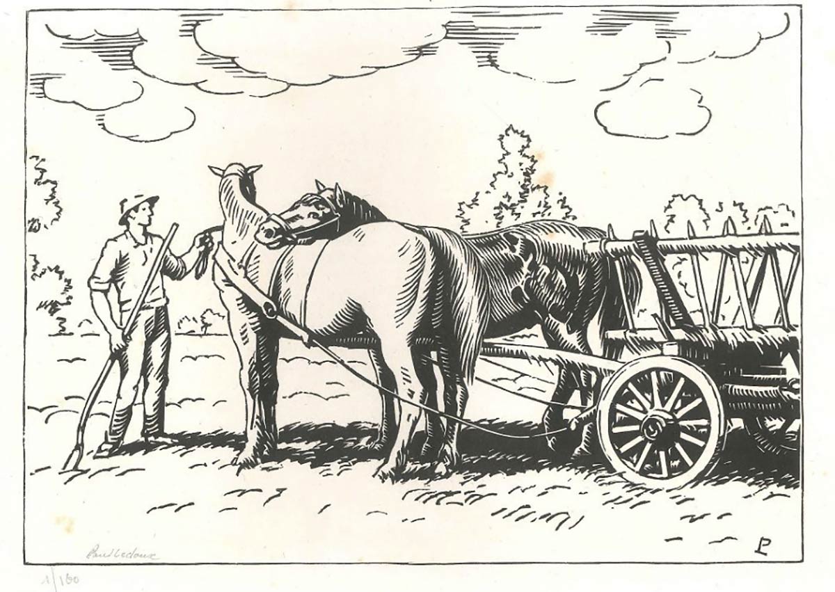 "L'attelage" è una bellissima xilografia originale realizzata da Paul Ledoux (1884-1960), come indicato dal monogramma in basso a destra. Firmata e numerata a matita sul margine inferiore. Edizione di 160 esemplari. In buone condizioni salvo fioritura diffusa. Passepartout in cartone bianco incluso. Quest'opera raffigura un contadino con il carro, fermato da una coppia di cavalli innamorati.