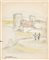 Bellissima e fresca opera che rappresenta un paesaggio con un edificio e due figure. I colori sono molto tenui grazie alle leggerissime pennellate di acquerello.