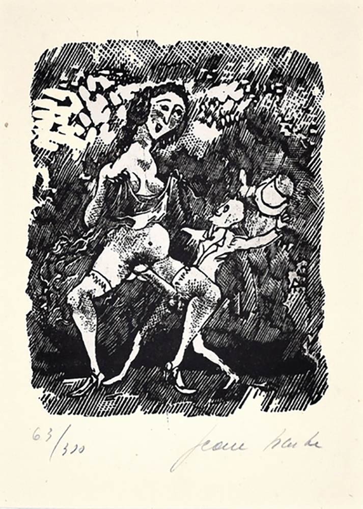 Linoleografia in bianco e nero su carta realizzata nel 1945 dall'artista italiano Mino Maccari. Firmata con lo pseudonimo di "Jean Barbe" e numerata a matita sul margine inferiore. Edizione di 300 esemplari.