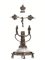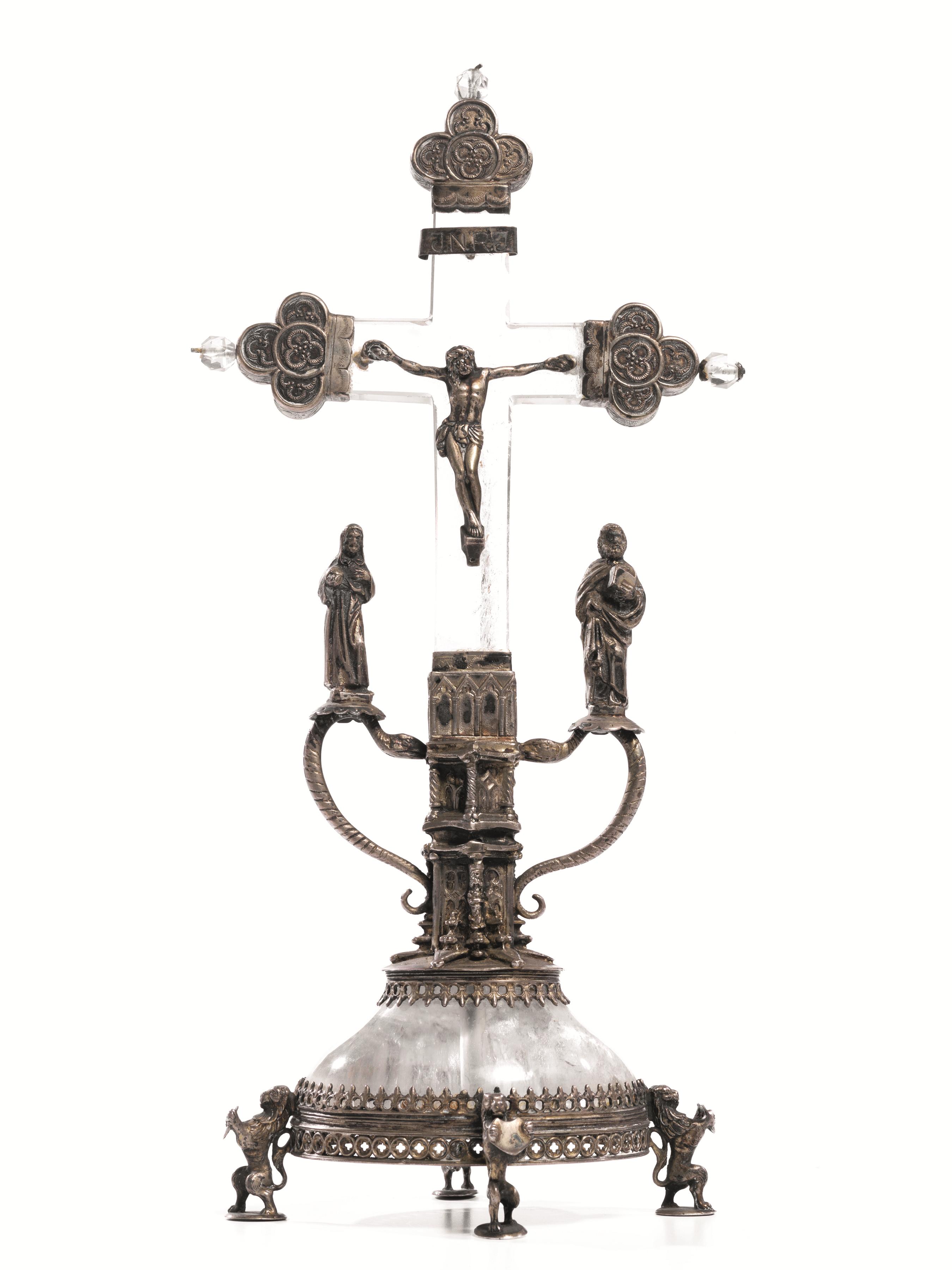Piccolo Crocefisso da altare, fine sec. XIX, in cristallo di rocca, con figura di Cristo, finali trilobati e figure di Santi in argento, poggiante su base ovale in cristallo di rocca poggiante su quattro piedini a leoni reggiscudo, alt. cm 32