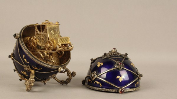 Firmato, datato. Uovo in argento smaltato blu con decori in oro e pietre dure incastonate in fili d'argento dorato e all'interno una carrozza. Europa dell'Est. XX secolo. Mis. Lung. cm. 10 Alt. cm. 11 ca.