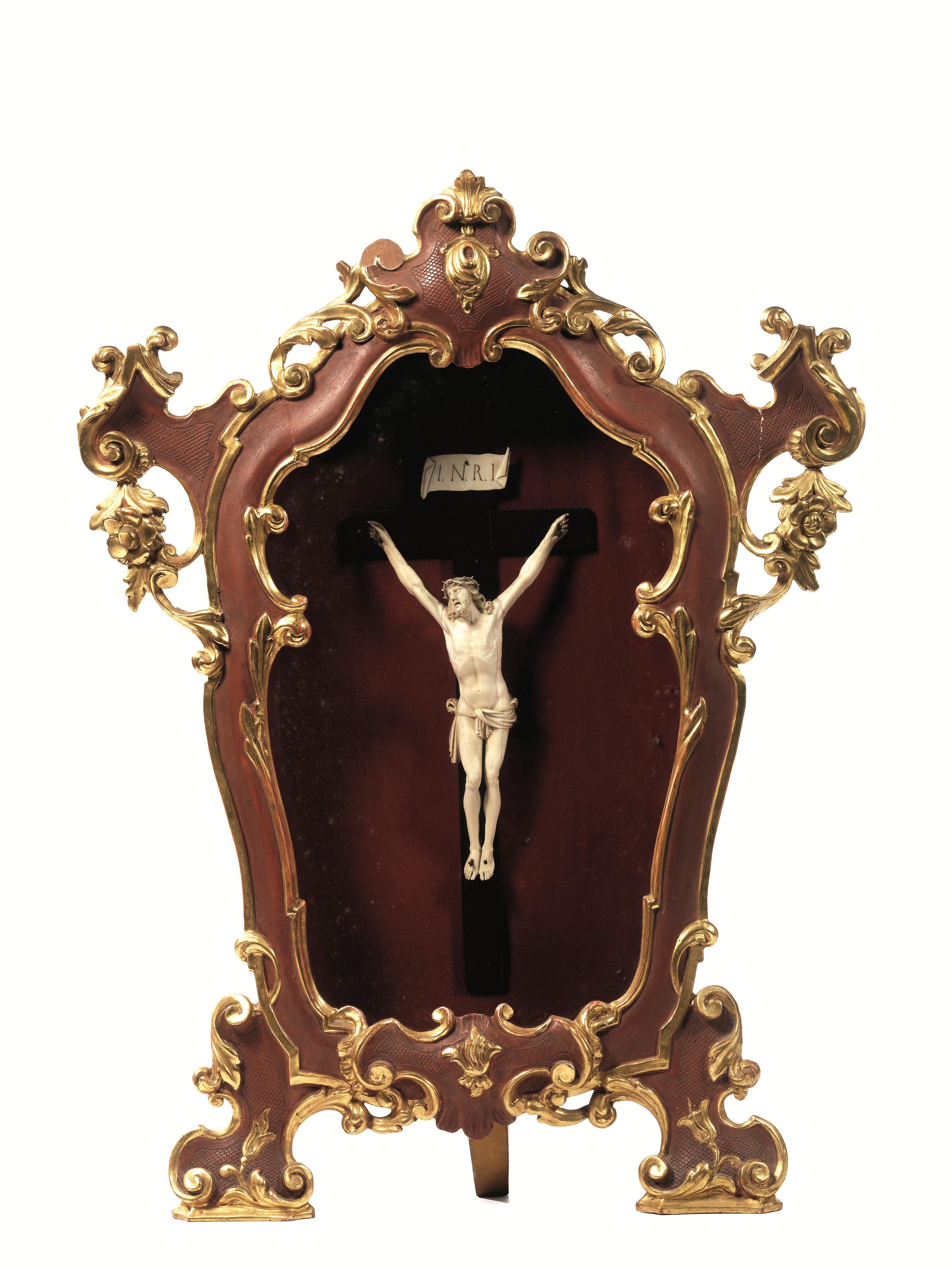 Crocefisso, sec. XIX, in avorio, cm 37x15,5, entro teca in legno dipinto rosso-oro di epoca posteriore, teca con piccoli danni e restauri