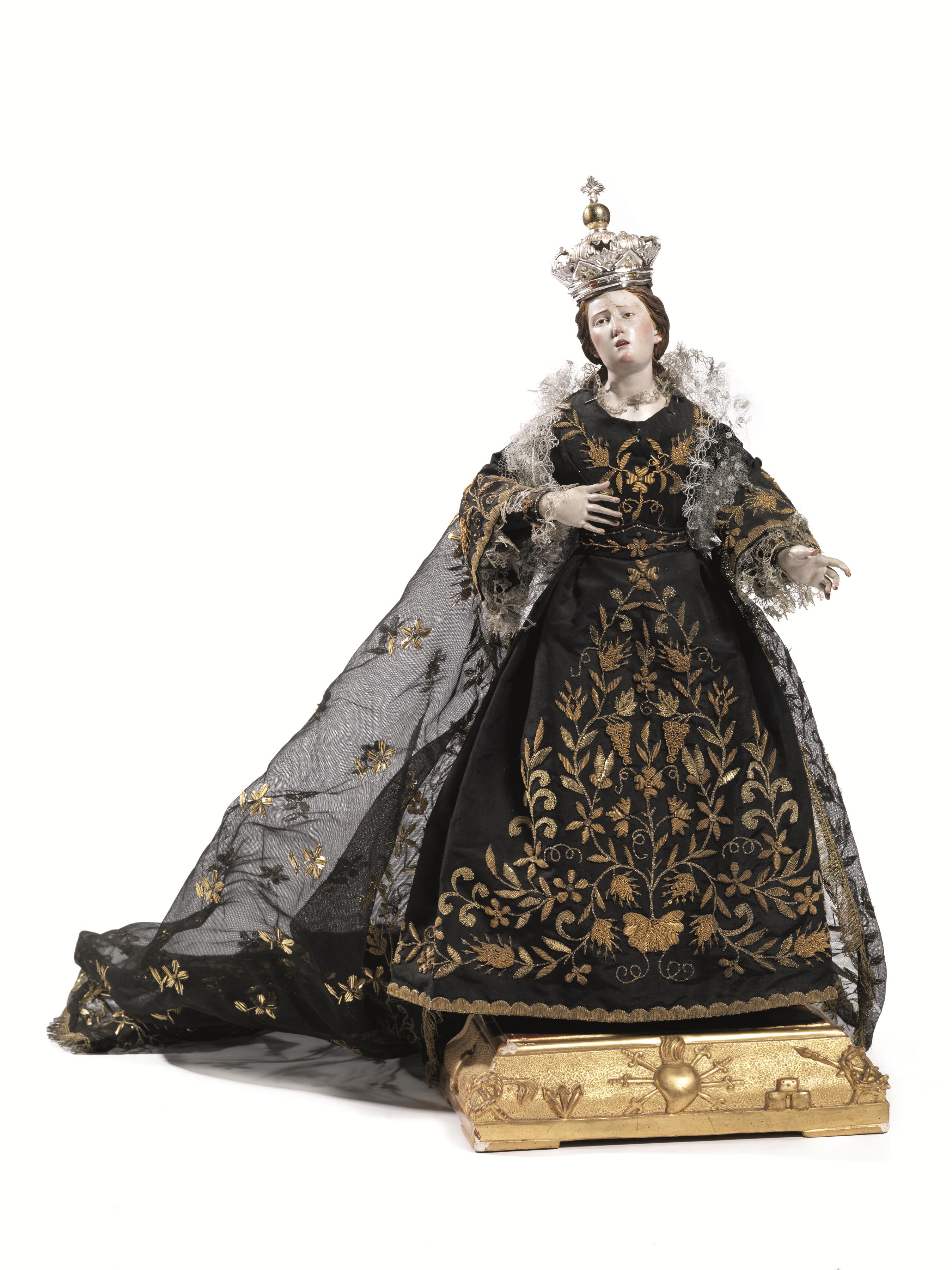 Scultura, Vergine orante, Napoli, fine sec. XVIII - inizi XIX, in legno policromo con abito in seta nera e corona in argento, alt. cm 48, su base in legno con simboli della passione