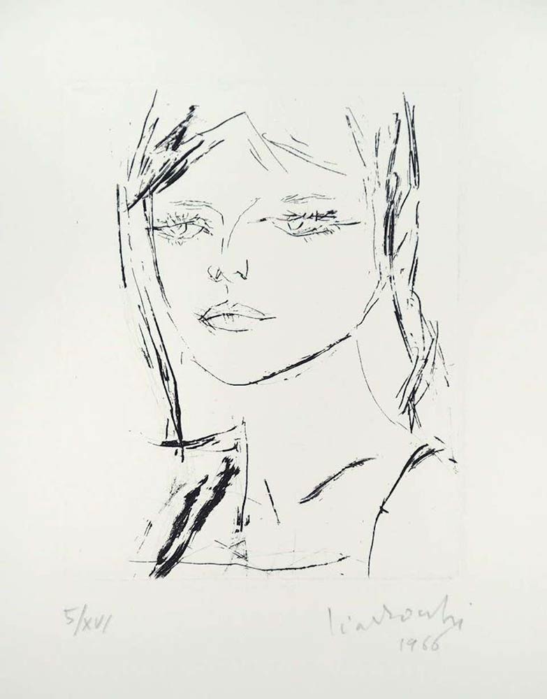 "Ritratto di Anna" è una bellissima acquaforte su carta, realizzata nel 1966 dall'artista italiano Arnoldo Ciarrocchi (1916-2004). Firmata e datata a matita dall'artista in basso a destra. Numerata a matita sul margine inferiore sinistro. Da un'edizione di 16 esemplari. Un meraviglioso ritratto di giovane donna con i grandi occhi sporgenti e labbra carnose realizzato in stile naif, con linee incisive e sintetiche tipiche per Ciarrocchi. In ottime condizioni.