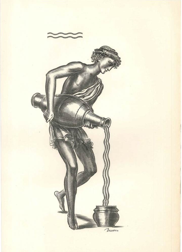 Aquarius è una raffinata incisione a bulino originale bianco e nero, realizzato da Albert Decaris. Firmata su lastra al margine inferiore destro. Questa bellissima stampa, che rappresenta il segno zodiacale dell'Acquario con una linea molto sintetica, è in ottime condizioni, salvo qualche consueto ingiallimento del margine. Compreso un passepartout in cartoncino bianco.