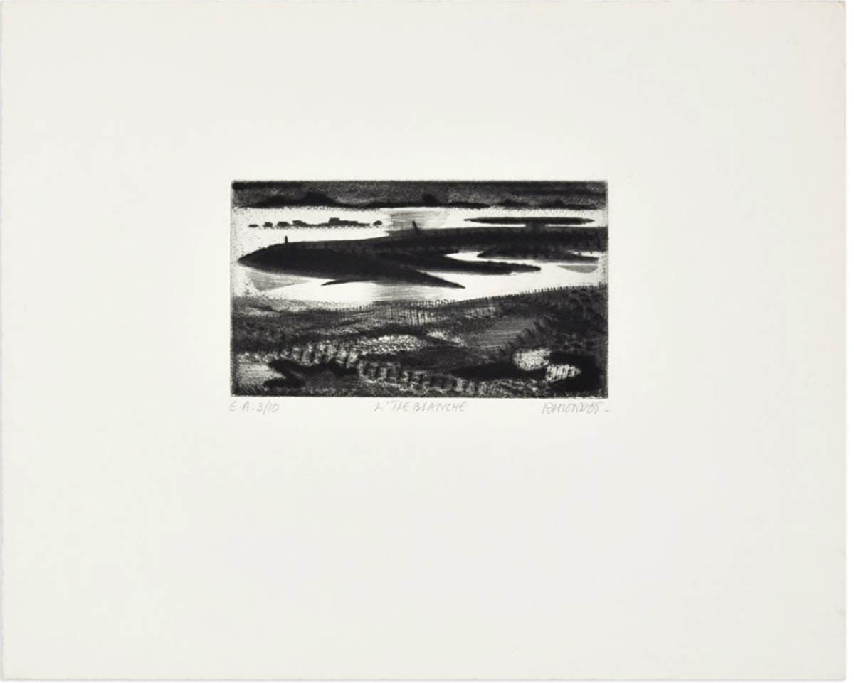 Interessante opera che raffigura un paesaggio astratto realizzato in bianco e nero. Forme orizzontali scure si presentano su un lago completamente bianco. Nella parte superiore della stampe è presente una fascia orizzontale di ombra scura rappresentante il cielo.