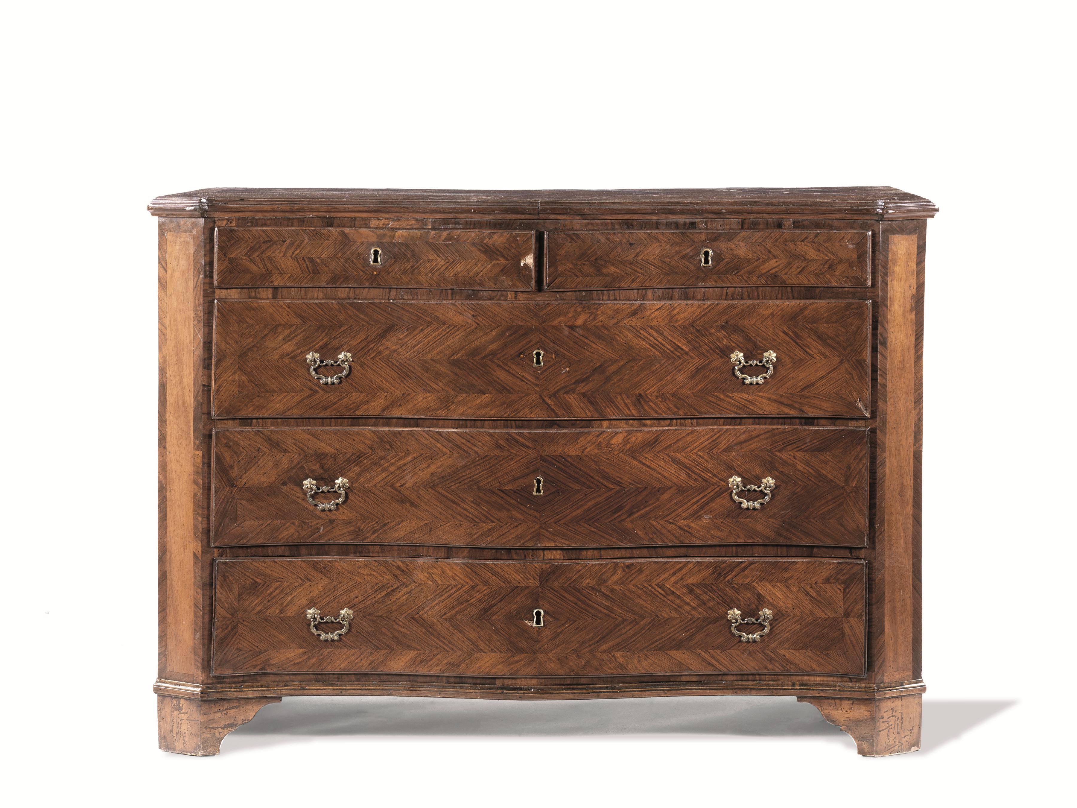 Cassettone, Italia centrale, metà secolo XVIII, in noce e radica, piano rettangolare sagomato sul fronte, fronte a doppia mossa, due sottili cassetti appaiati sotto al piano e tre sottostanti, specchiature dei cassetti intarsiate a motivo a lisca di pesce, piedi a mensola, cm 133x63x96, lievi danni