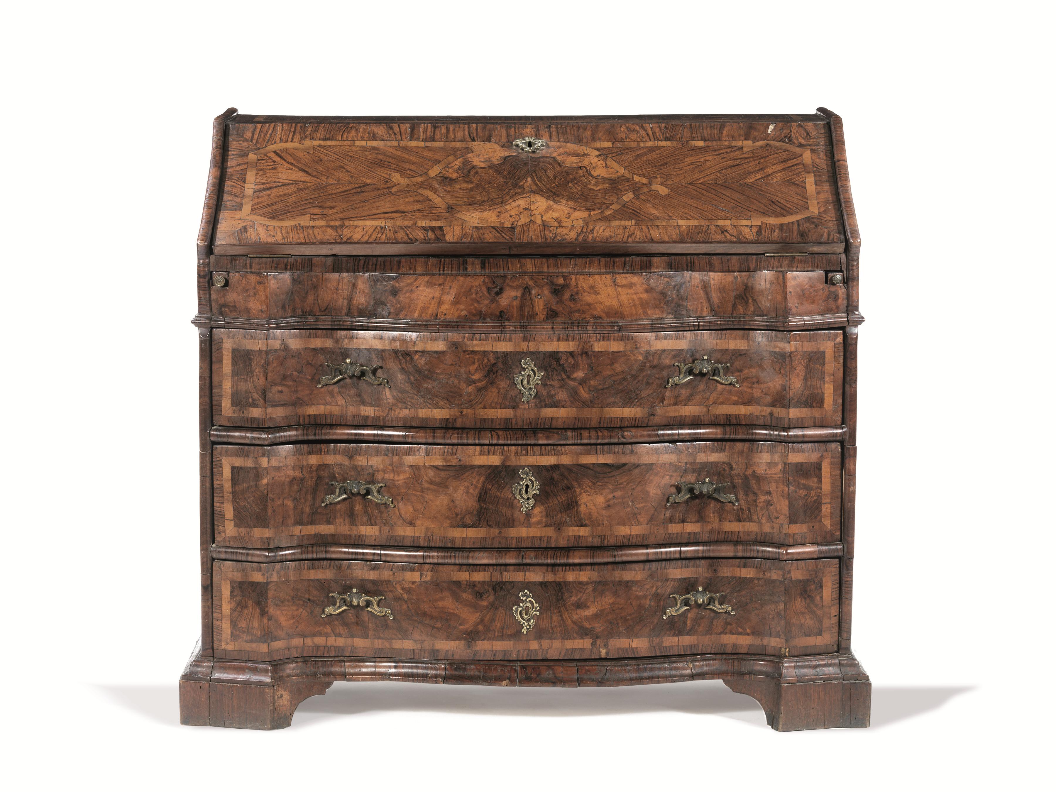 Cassettone scrivania, Emilia, metà sec. XVIII, in radica di noce e radica di...