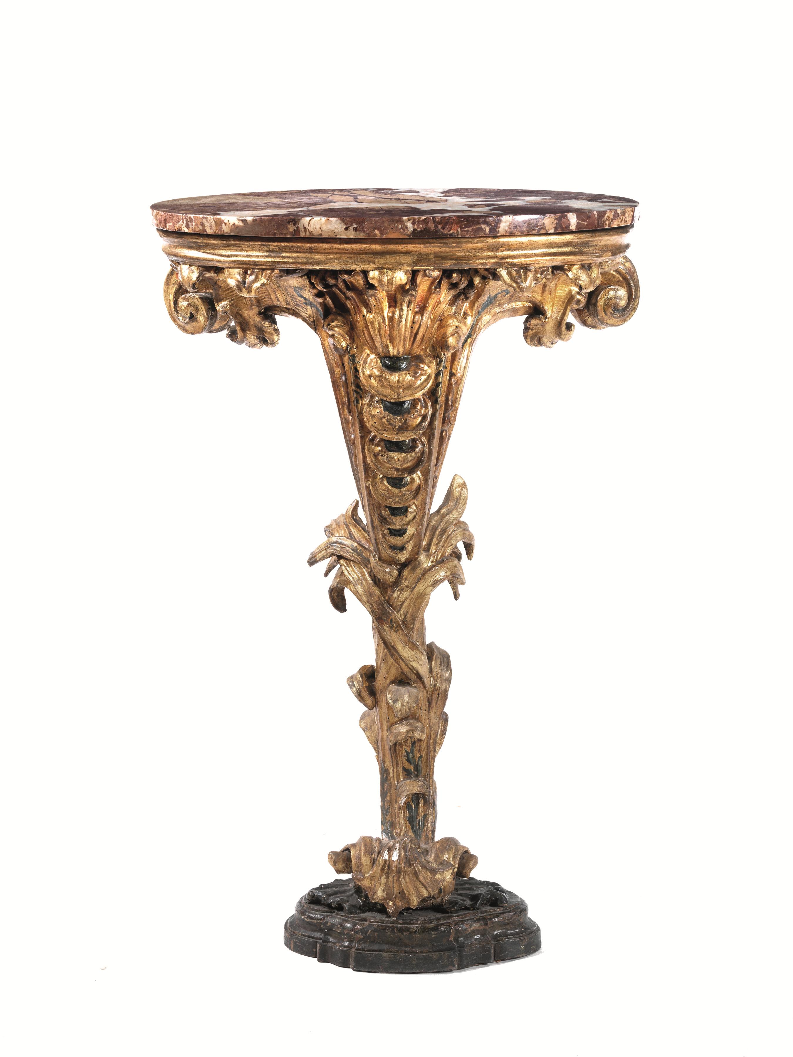 Gueridon, Roma, prima metà sec. XVIII, in legno intagliato e dorato a mecca, piano ovale in breccia di marmo rosso di epoca posteriore, sostegno modellato a grande voluta di foglie d'acanto su base sagomata dipinta a finto marmo, cm 59x43x94, lievi danni