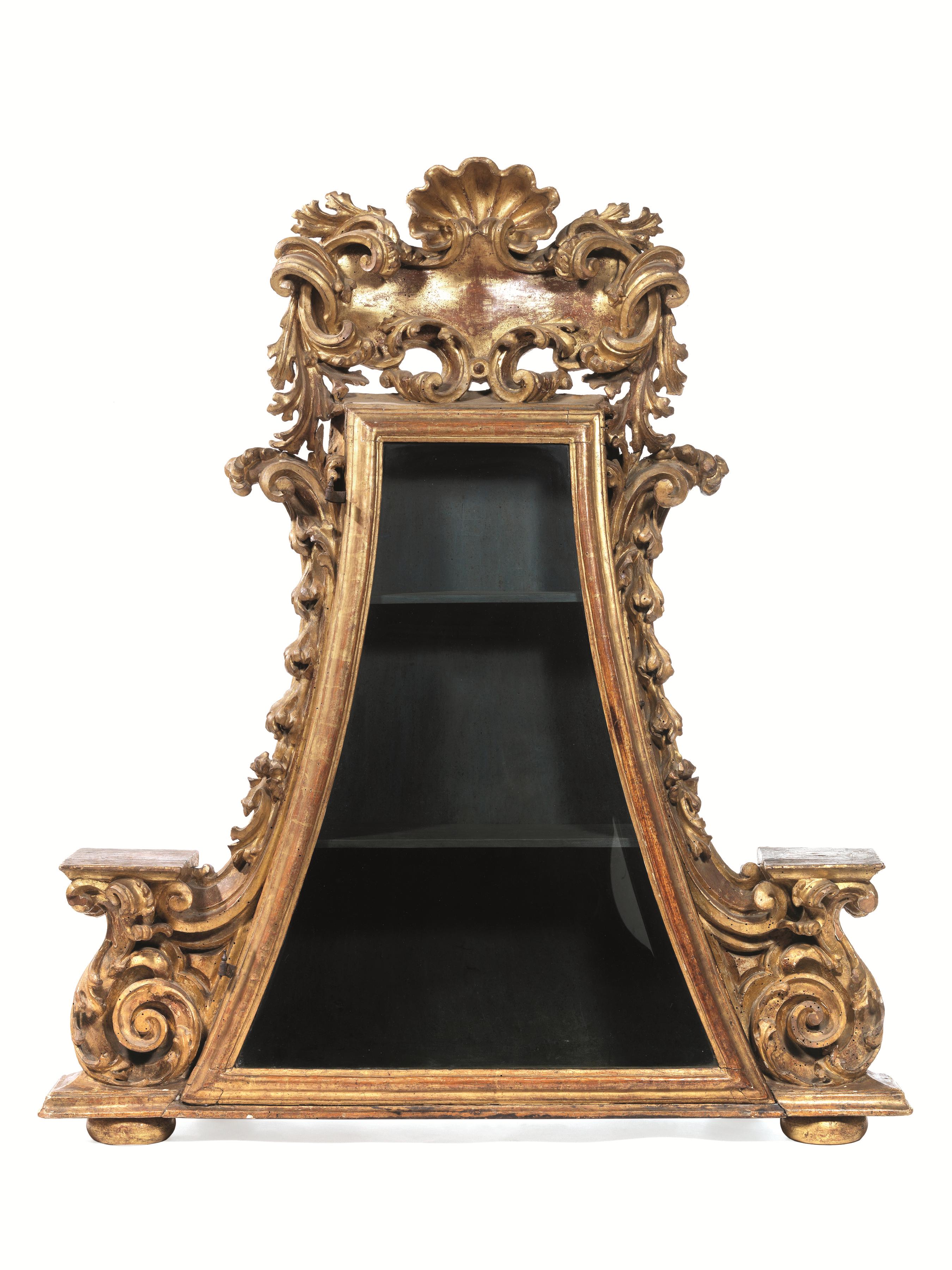 Teca, Roma, prima metà sec. XVIII, in legno intagliato e dorato sormontata da volute di foglie e conchiglia, uno sportello a vetri, tre ripiani interni e due pianetti porta vaso impostati lateralmente, base modanata, piedi a cipolla, cm 118x22x133