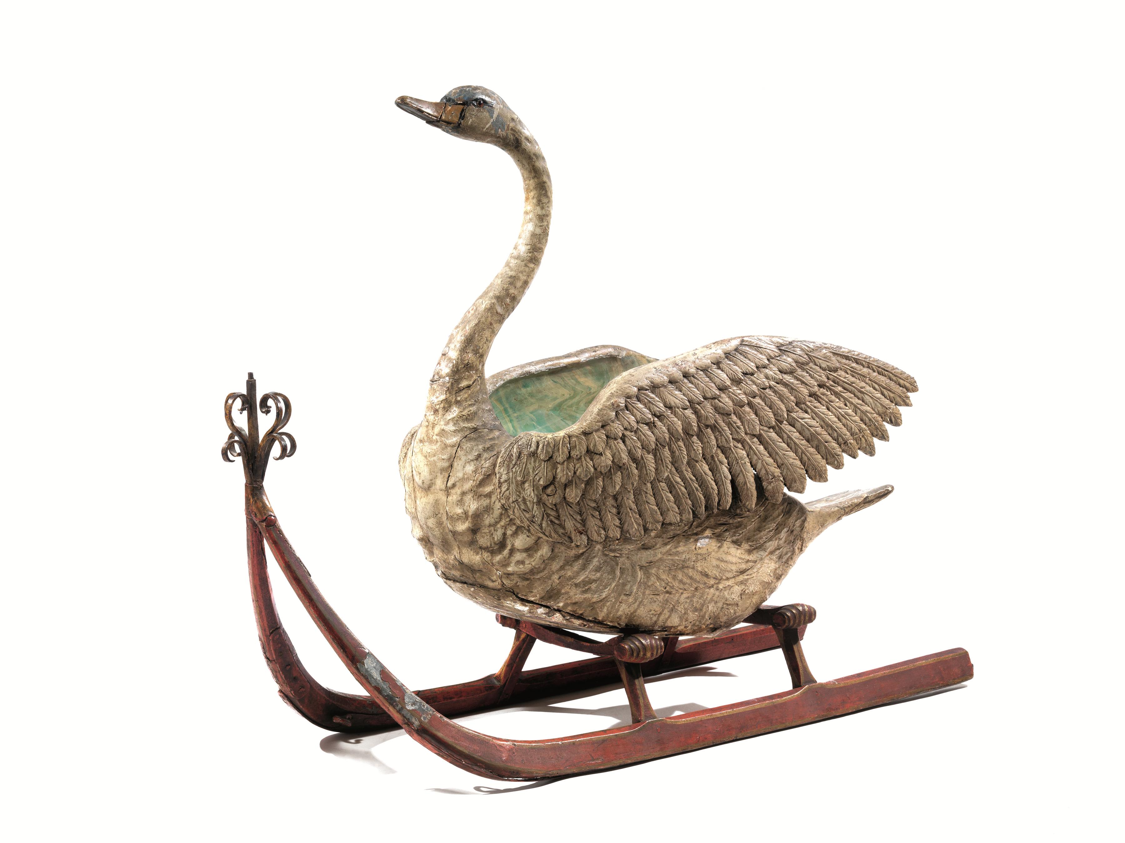 Slitta, Veneto, fine sec. XVIII, inizi sec. XIX, in legno realisticamente dipinto e scolpito a cigno con ali ripiegate, lungh. cm 133, alt. cm 98, alcuni danni e restauri