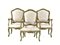 Tre poltrone, Italia centrale, metà sec. XVIII, in legno intagliato e dipinto nei toni del verde e dell'ocra, spalliera sagomata centrata da motivo fitomorfo, braccioli mossi, gambe sinuose, ricoperte in seta avorio, restauri alla pittura (3)