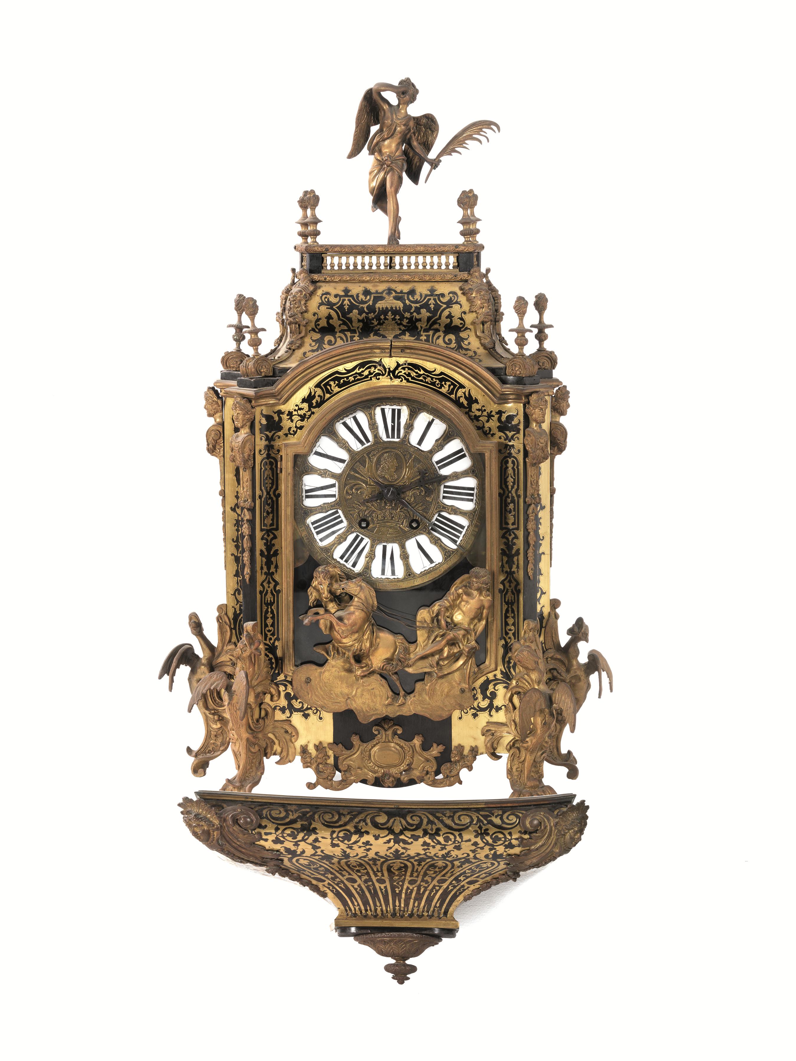 Orologio a mensola, Francia, seconda metà sec. XIX, in stile Boulle, cassa sagomata con decori in bronzo sormontata da angelo, quattro piedini modellati ad animali fantastici, quadrante con riserve in smalto con numeri romani, meccanismo con scappamento ad ancora, sospensione in lamina d'acciaio, suona le ore e le mezz'ore, completo di mensola, alt. cm 120, meccanismo da revisionare