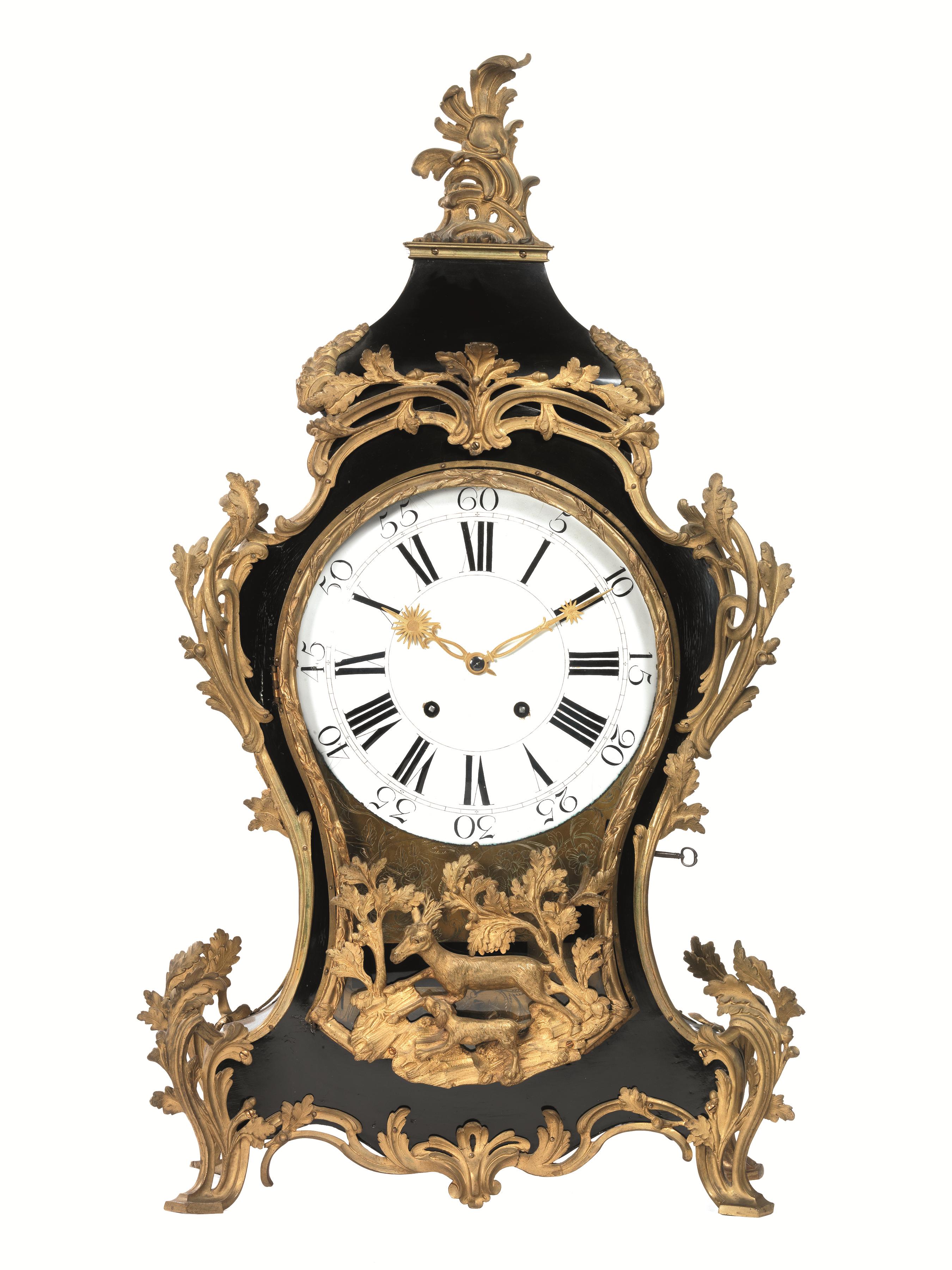 Orologio soprammobile, Zurigo, fine sec. XVIII, cassa sagomata in legno ebanizzato, fronte decorato da cervo con cane entro paesaggio in bronzo dorato a basso rilievo, profili a volute vegetali. quadrante in smalto con numeri romani, poggiante su quattro piedini a tralci fogliacei, meccanismo firmato Jo. Pfenninger Zurich con scappamento ad ancora, sospensione a lamina d'acciaio, carica otto giorni, suona le ore, le mezz'ore ed i quarti, alt. cm 98, meccanismo da revisionare