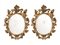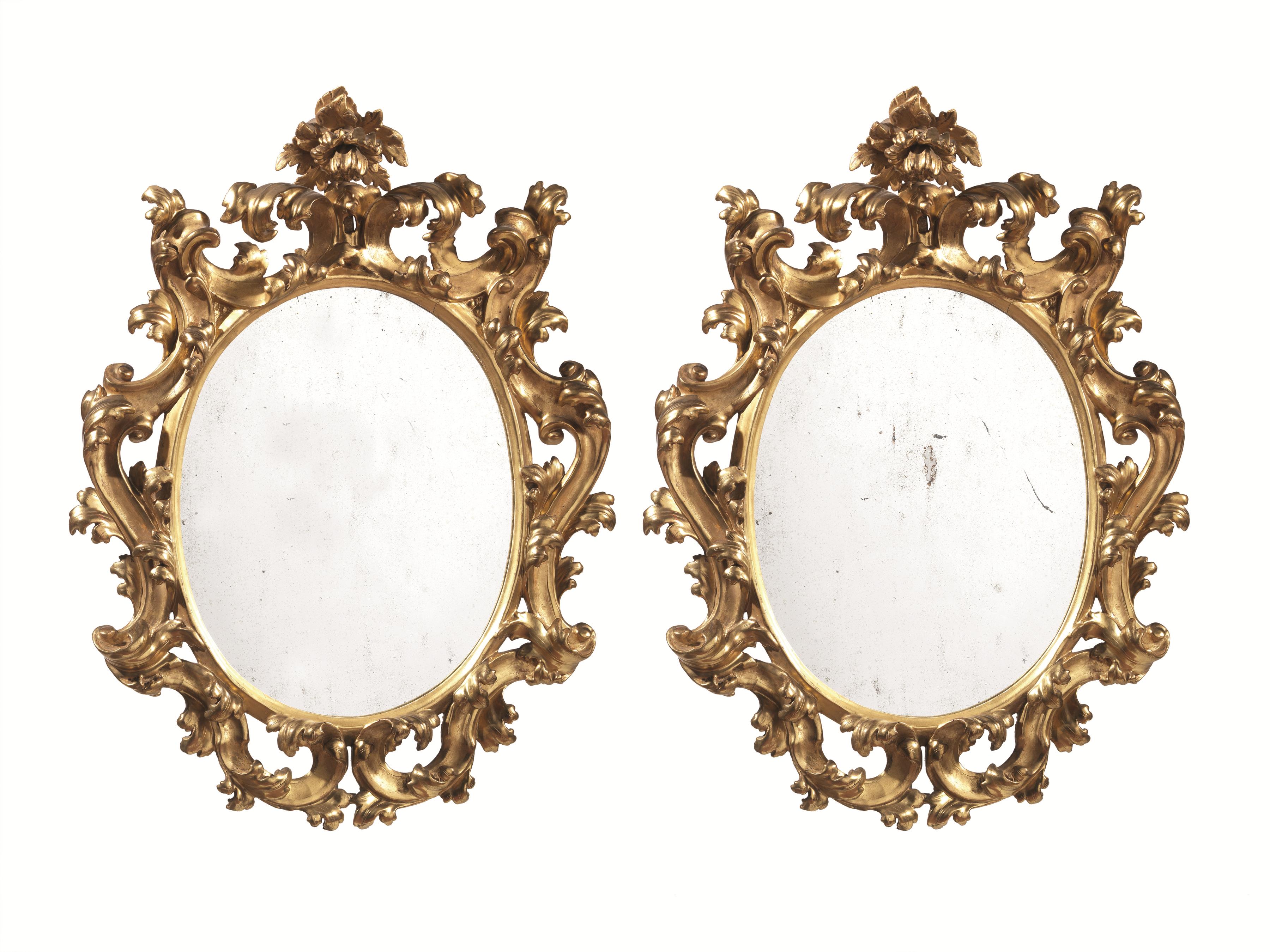 Coppia di specchiere ovali, metà sec. XIX, in legno intagliato e dorato, cimasa centrata da infiorescenza, bordo a grandi volute contrapposte, cm 94x69 (2)