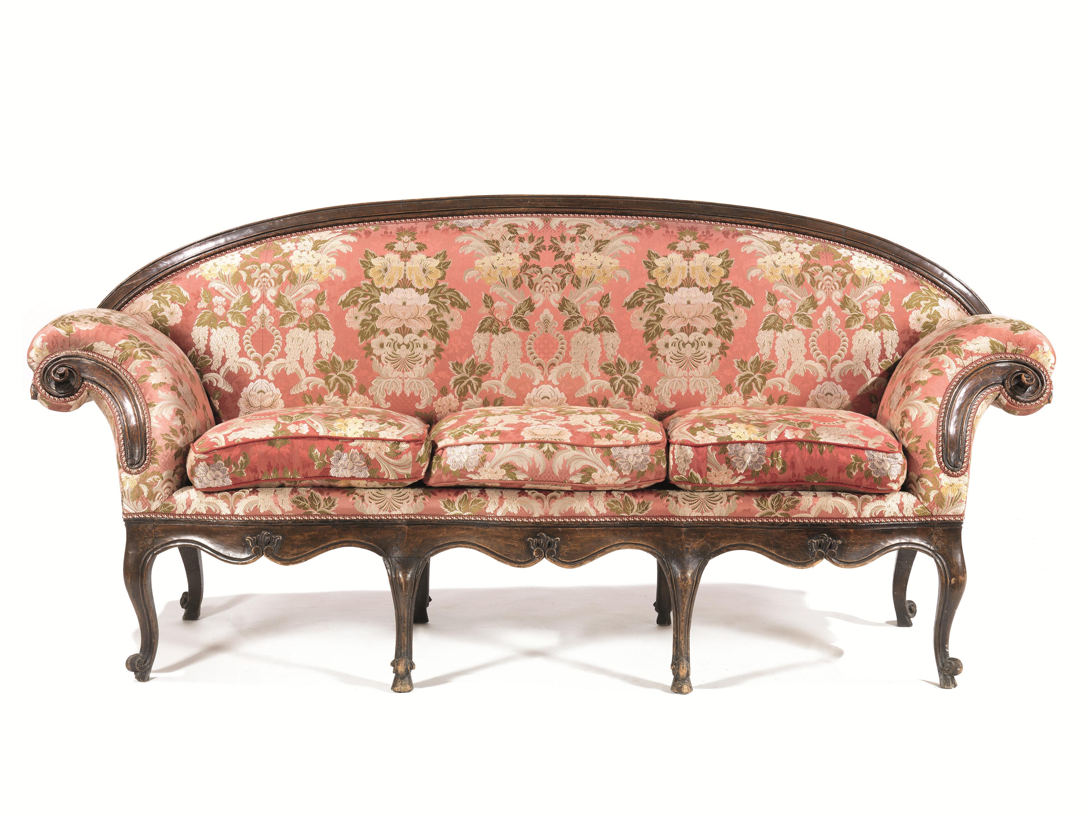 Divano a ventaglio, Veneto, metà secolo XVIII, in noce, spalliera centinata, braccioli intagliati a volute, gambe mosse su piedi a ricciolo, ricoperto in seta operata, lungh. cm 238