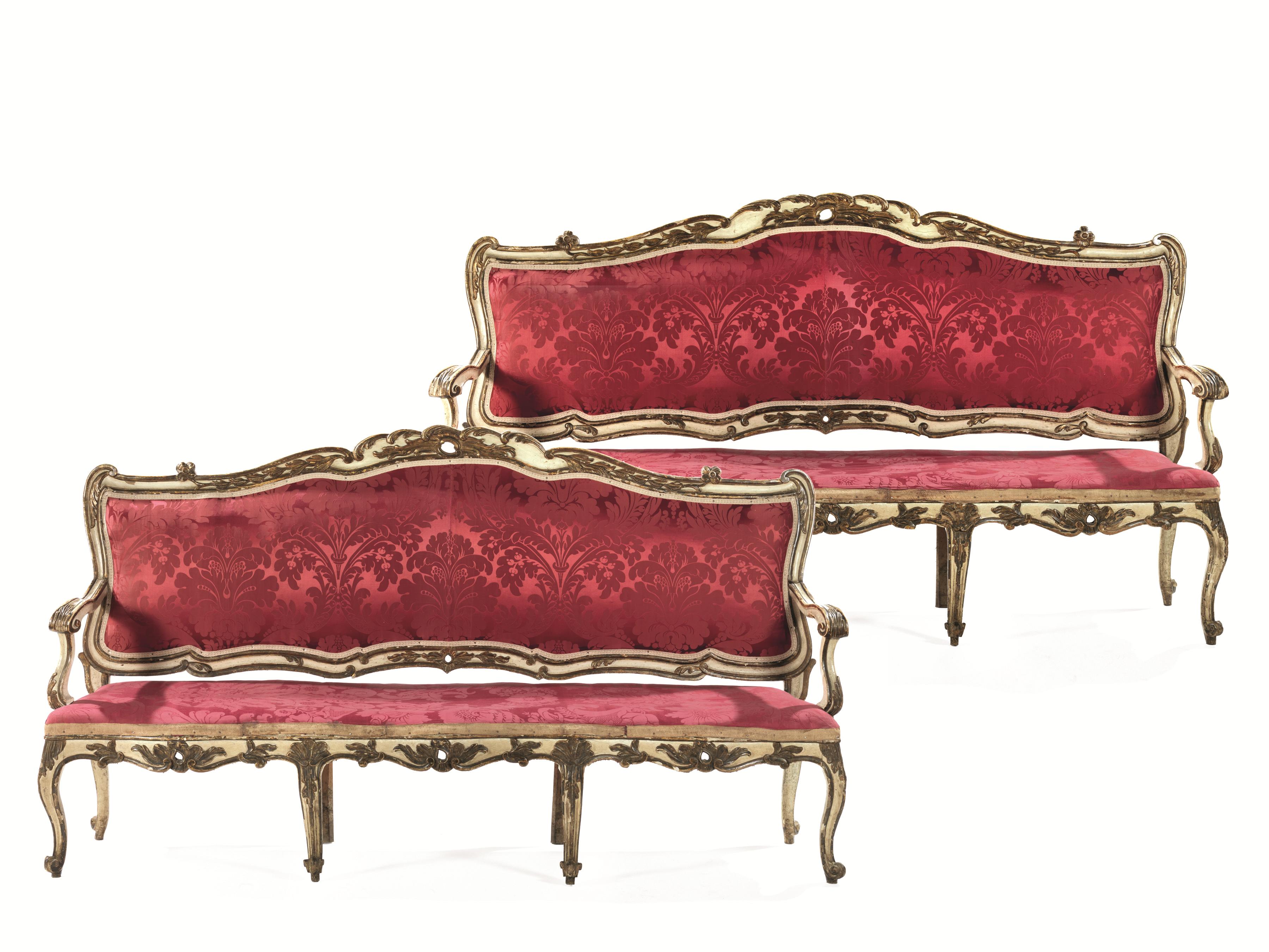 Coppia di divani, Italia centrale, metà sec. XVIII, en suite con il lotto precedente, in legno intagliato, dipinto bianco e dorato a mecca, spalliera sagomata e traforata a volute, braccioli mossi a giorno con estremità a ricciolo, fascia intagliata a volute contrapposte, gambe sinuose su piedi a ricciolo, lungh. cm 213, ricoperti in damasco rosso, lievissimi danni (2)