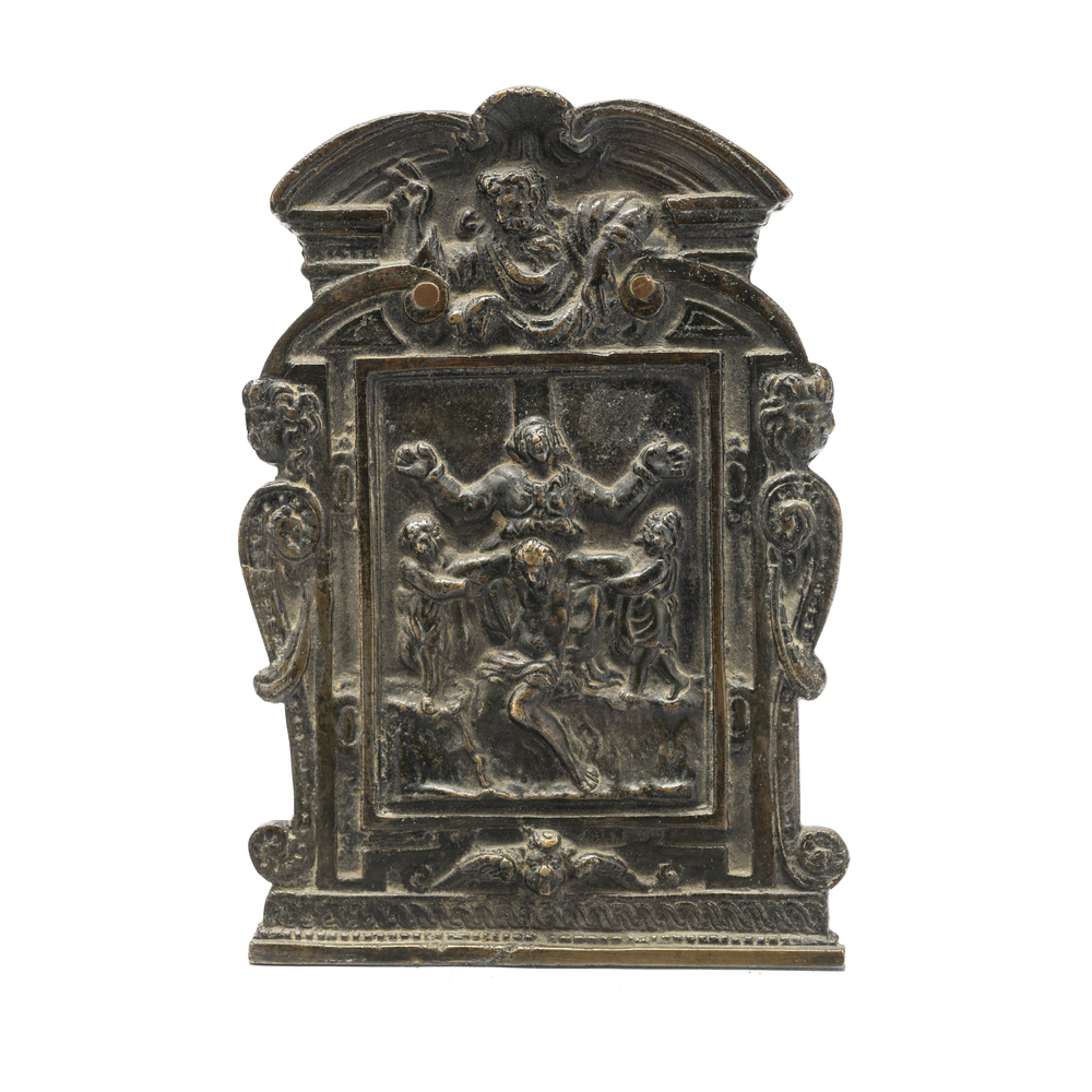 La prestigiosa scultura di bronzo, detta "pace", è da assegnare a uno scultore lombardo o veneto del XVI secolo. Essa è contornata da una bella cornice di gusto sansovinesco. La raffigurazione si rifà ai modelli tardo rinascimentali in uso nella ricca produzione di bronzi e placchette, collocabile nei territori compresi tra la Lombardia ed il Veneto nella seconda metà del Cinquecento