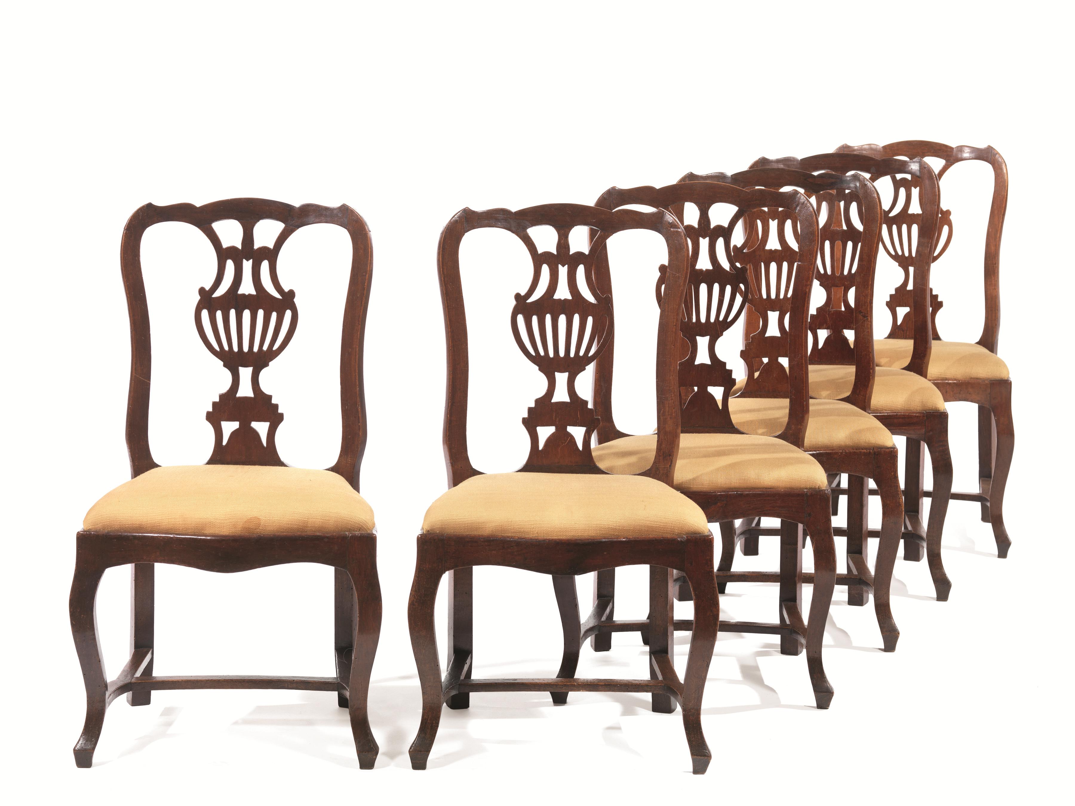 Sei sedie, Toscana, seconda metà sec. XVIII, in noce intagliato, spalliera sagomata centrata da cartella traforata a vaso stilizzato, gambe mosse con traversa ad H, sedili ricoperti in lino giallo (6)