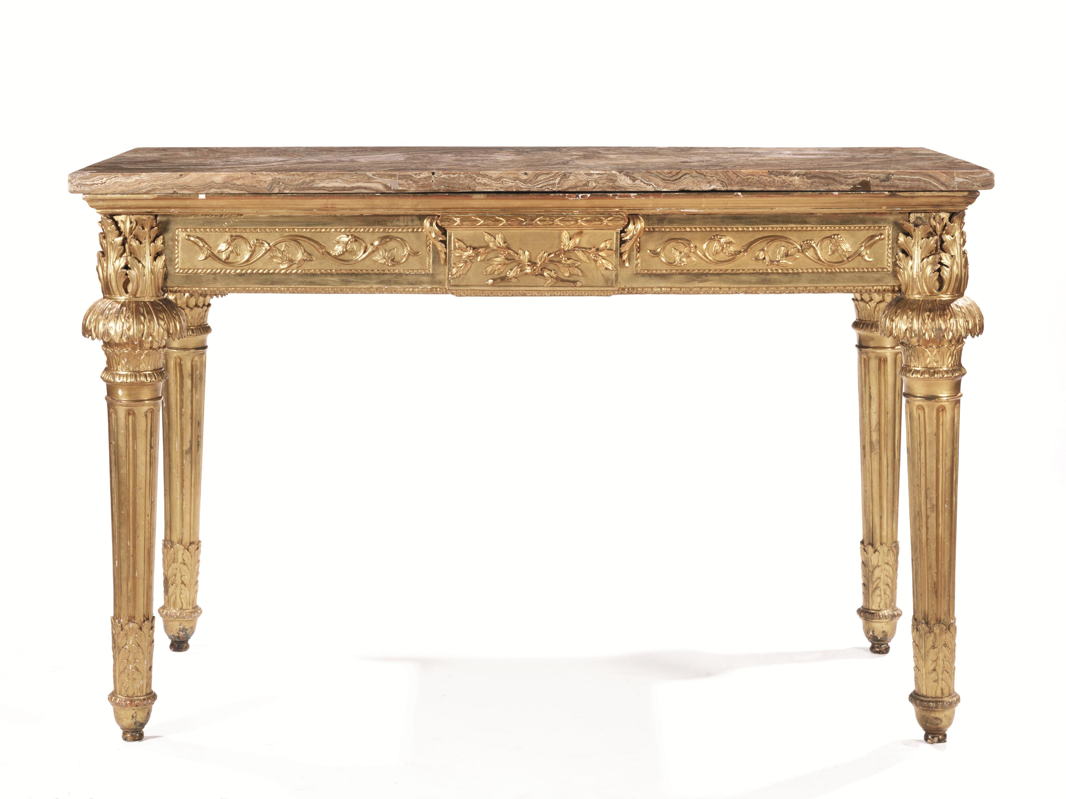 Importante console, Piemonte, fine, secolo XVIII, in legno intagliato e dorato, piano rettangolare in alabastro cotognino, fascia decorato da volute vegetali, gambe scannellate intagliate con foglie d’acanto, piedi a trottola, cm 149x75x97, piccoli danni