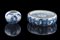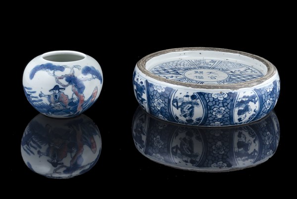 Manifattura cinese, lotto composto da uno sciacquapennelli in porcellana, recante marchio apocrifo Kangxi, del periodo della Repubblica (1912-1949), e un porta inchiostro bianco e blu decorato con gli otto immortali, del sec. XIX