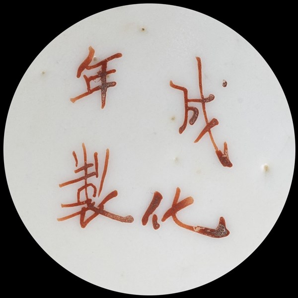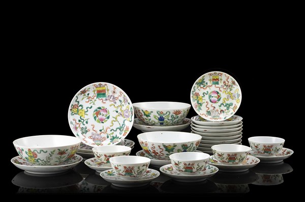 Lotto composto da ventuno piattini di formato diverso, tre ciotole e cinque tazzine, in porcellana decorata con simboli di buon auspicio (difetti)