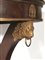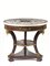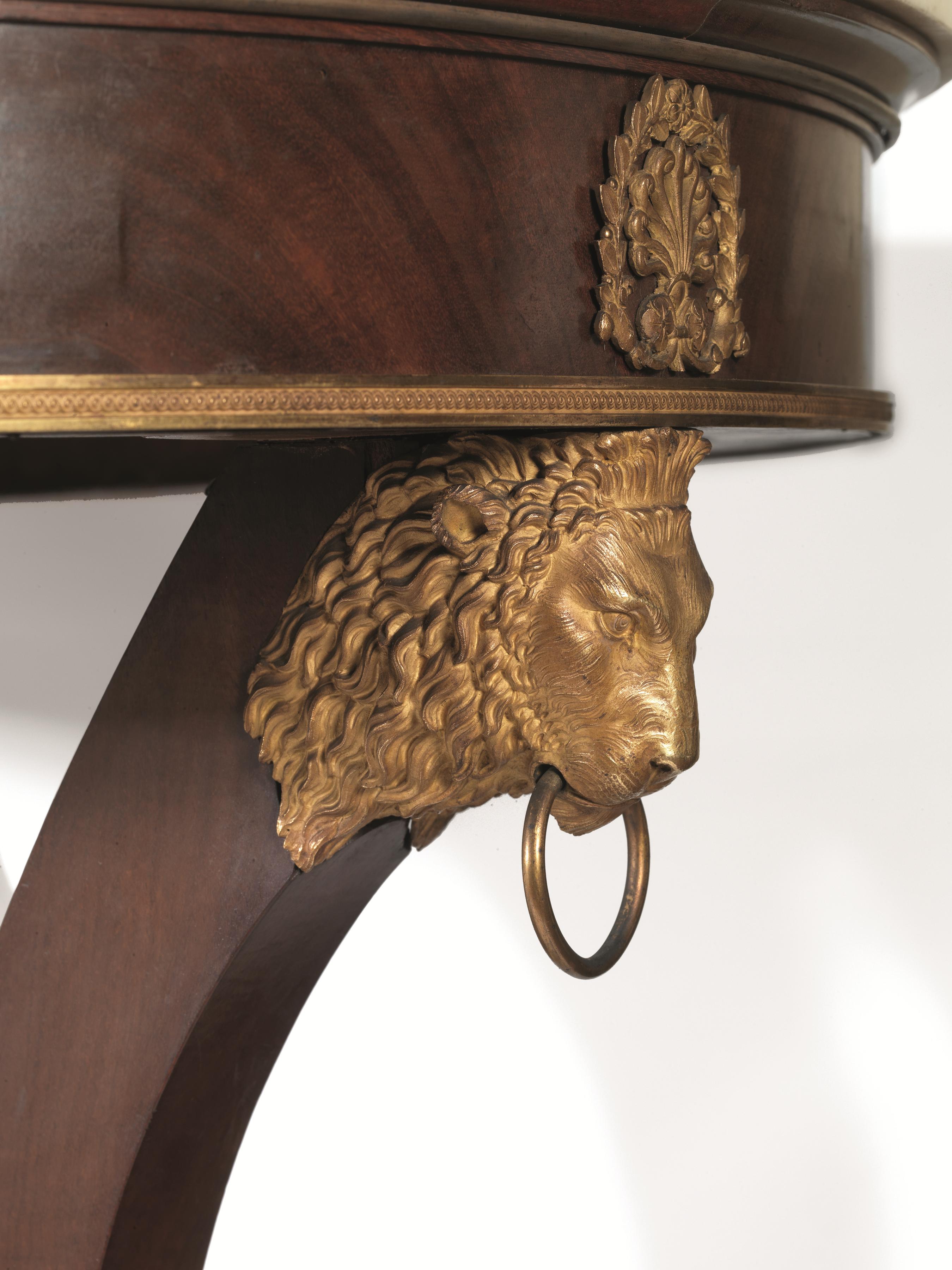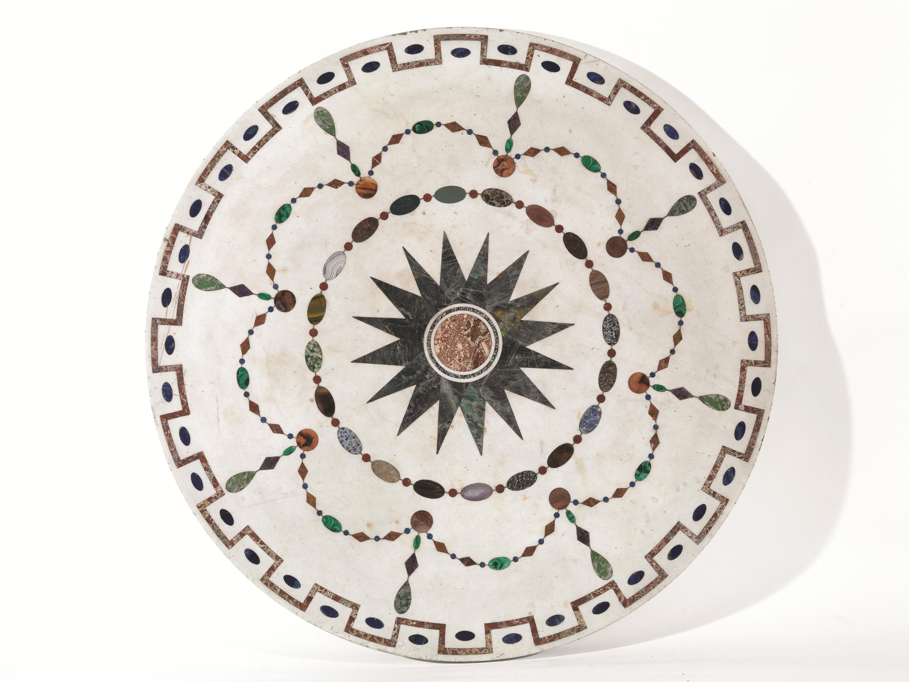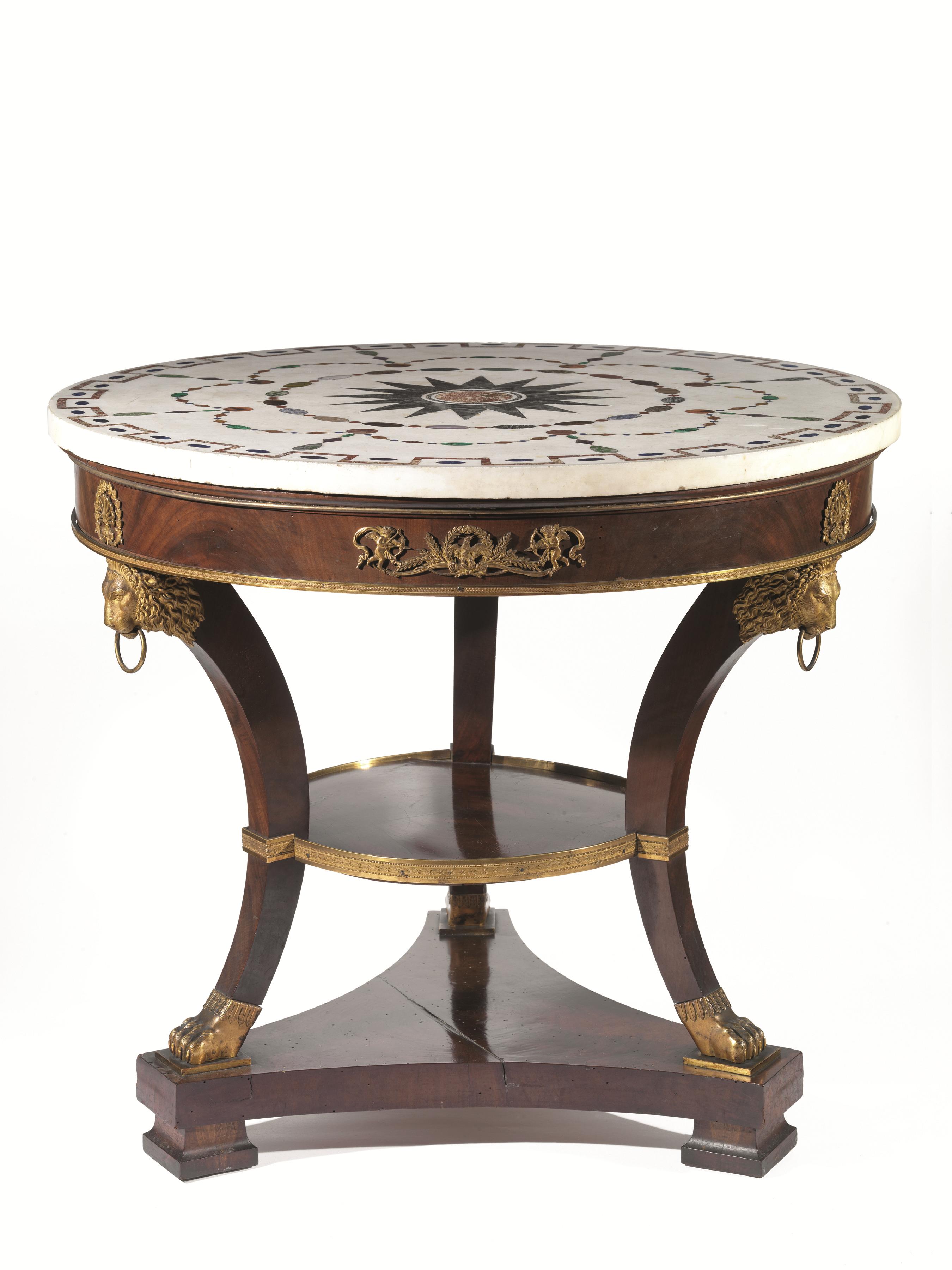 Importante tavolo, Russia, prima metà sec. XIX, in radica di noce con applicazioni in bronzo dorato, piano circolare in marmo bianco riccamente intarsiato con pietre semipreziose centrato da rosa dei venti fra motivi a collane e greca stilizzata, fascia decorata con palmette e amorini saettanti, tre sostegni ricurvi con finali a teste di leone in bronzo, sottopiano circolare, base triangolare su piedi a plinto, cm 76x87