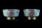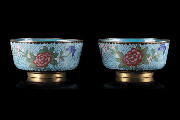 Coppia di ciotole in smalto cloisonné a fondo azzurro decorato con fiori policromi